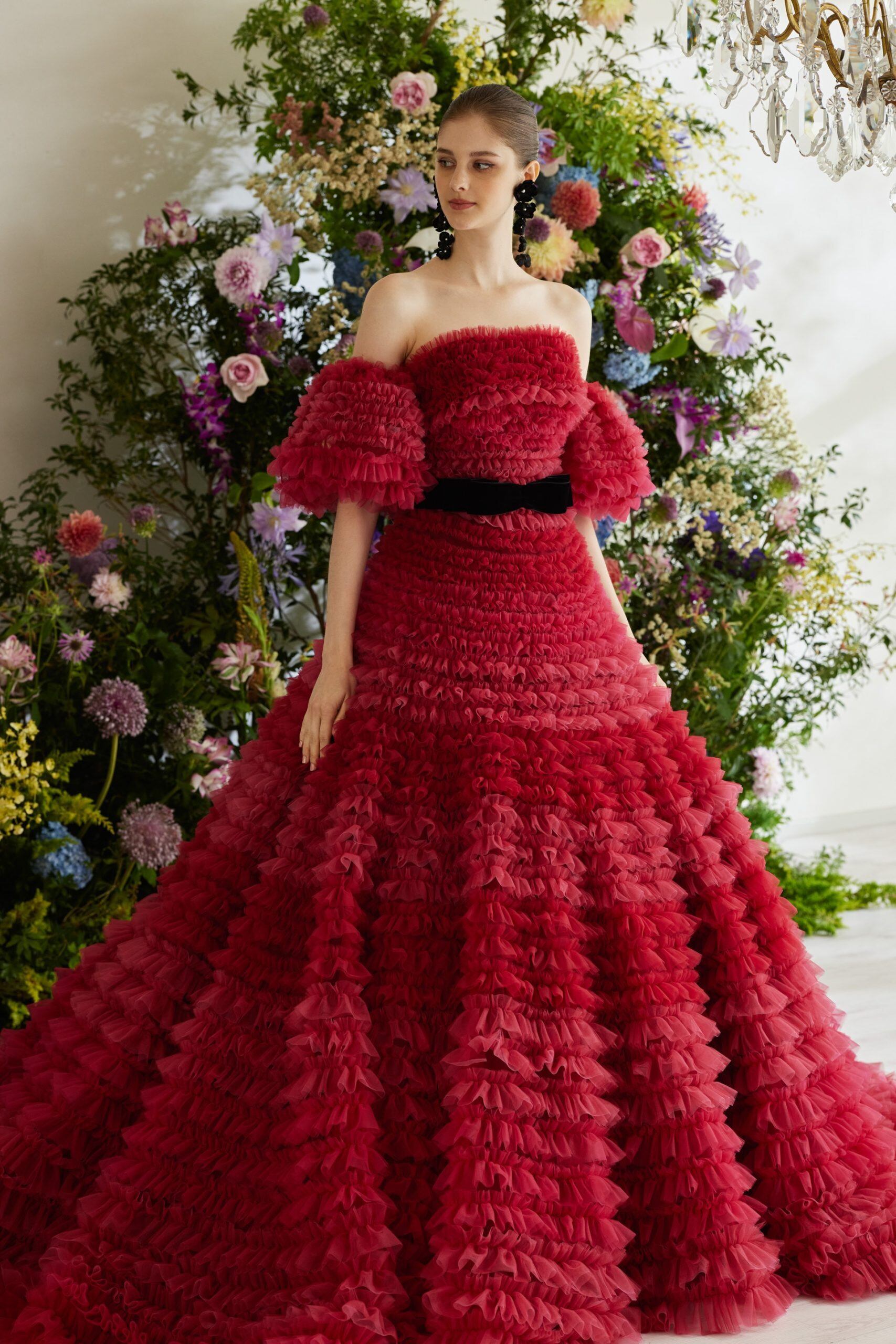 カラードレス 赤/レッド ベアトップ パフスリーブ サッシュベルト ボリュームドレス 短トレーン フリルドレス