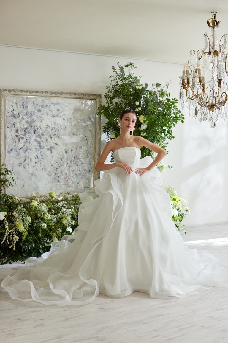 ウエディングドレス オフホワイト ベアトップ ビスチェタイプ ソフトチュール 華やかなトレーン