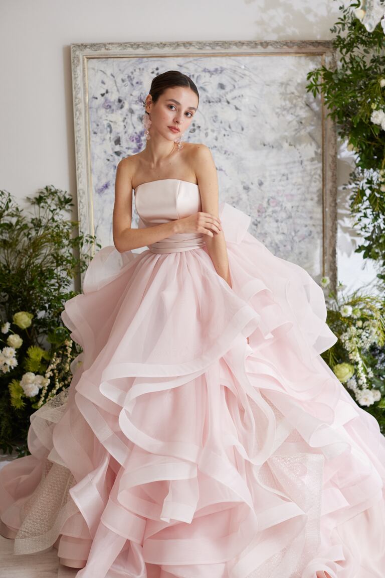 高品質!カラードレス ピンク ベアトップ ソフトチュール ラッフルフリル ノースリーブ 華やかなトレーン
