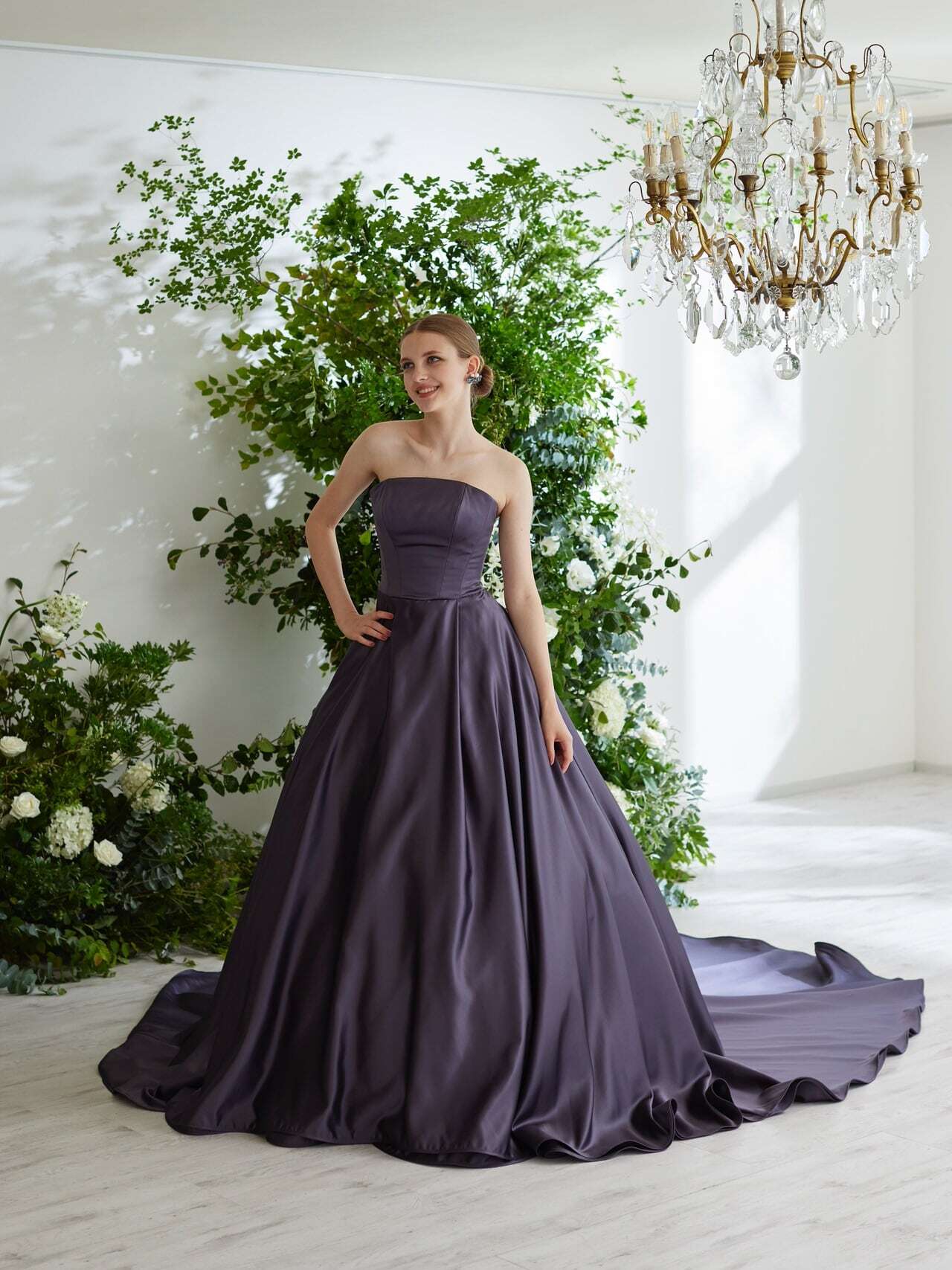 高品質!カラードレス フリル パープル/紫 ベアトップ 取り外しオフショルダー クラシカル 華やかなトレーン