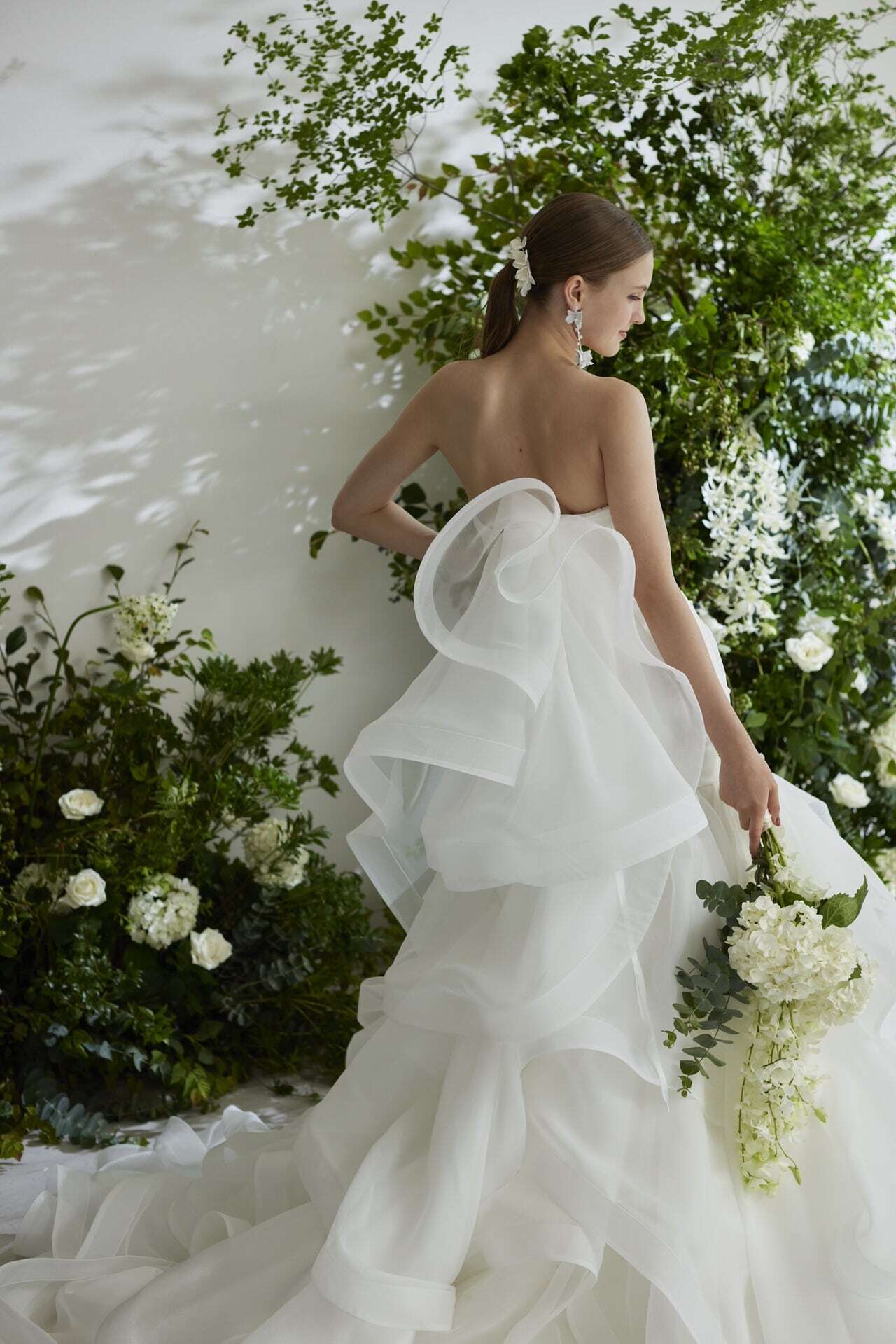 ウエディングドレス オフホワイト ソフトチュール ベアトップ 華やかなトレーン