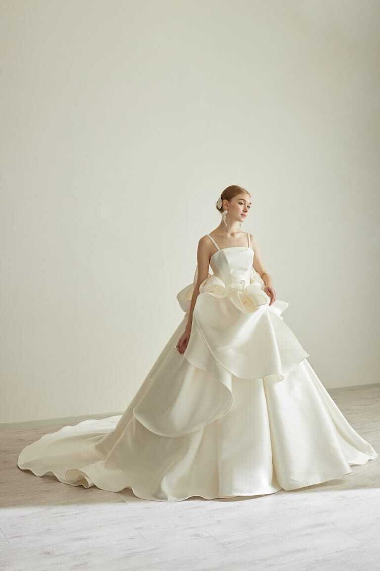 ウエディングドレス オフホワイト オンショルダードレス 光沢サテン 高品質!華やかなトレーン