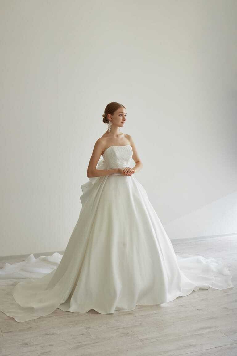 ウエディングドレス オフホワイト レース ベアトップ ソフトチュール 華やかなトレーン