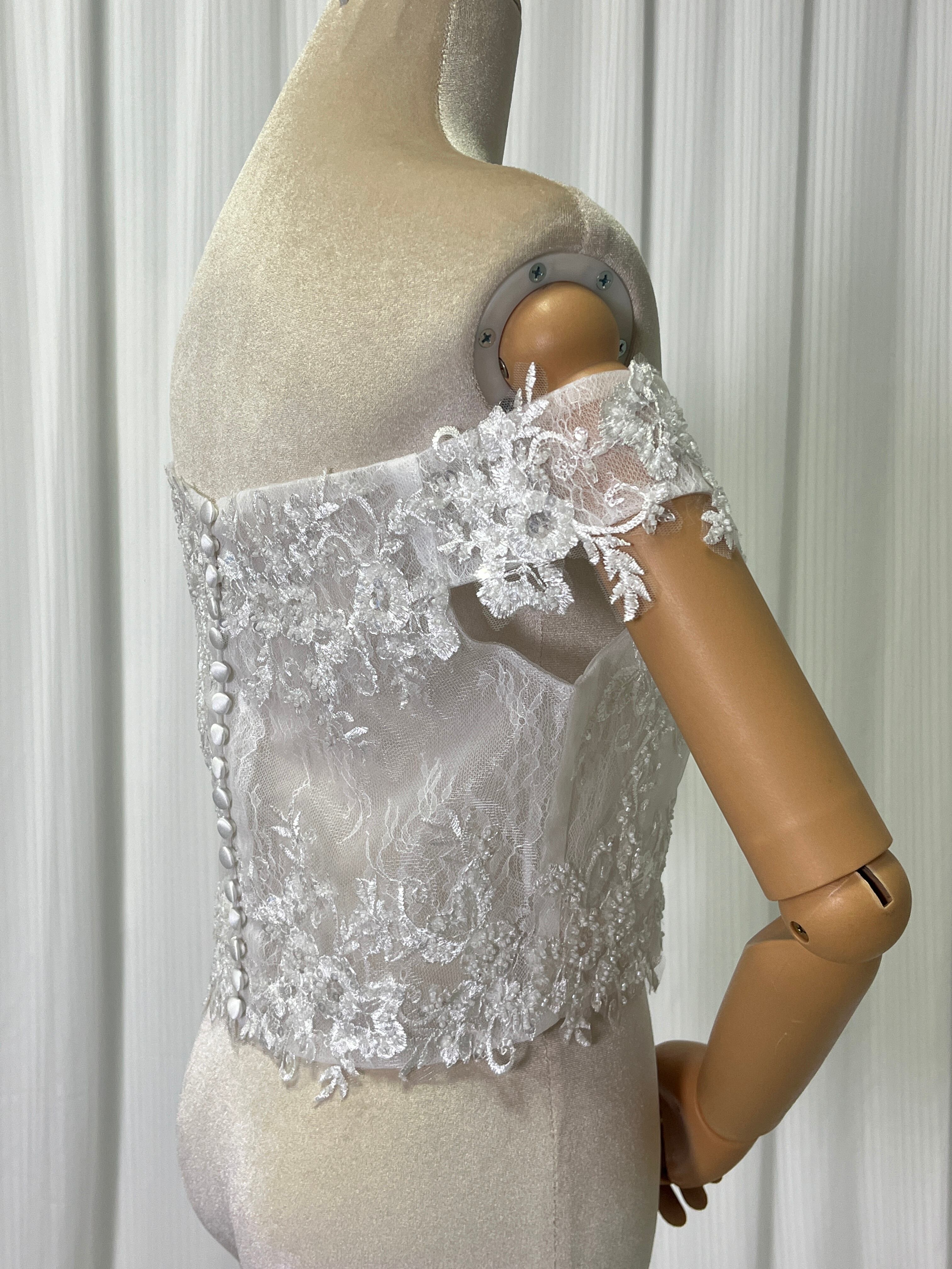 ウエディングドレス オフホワイト 総レース オフショルダー くるみボタン 細見えシルエット 上品レース