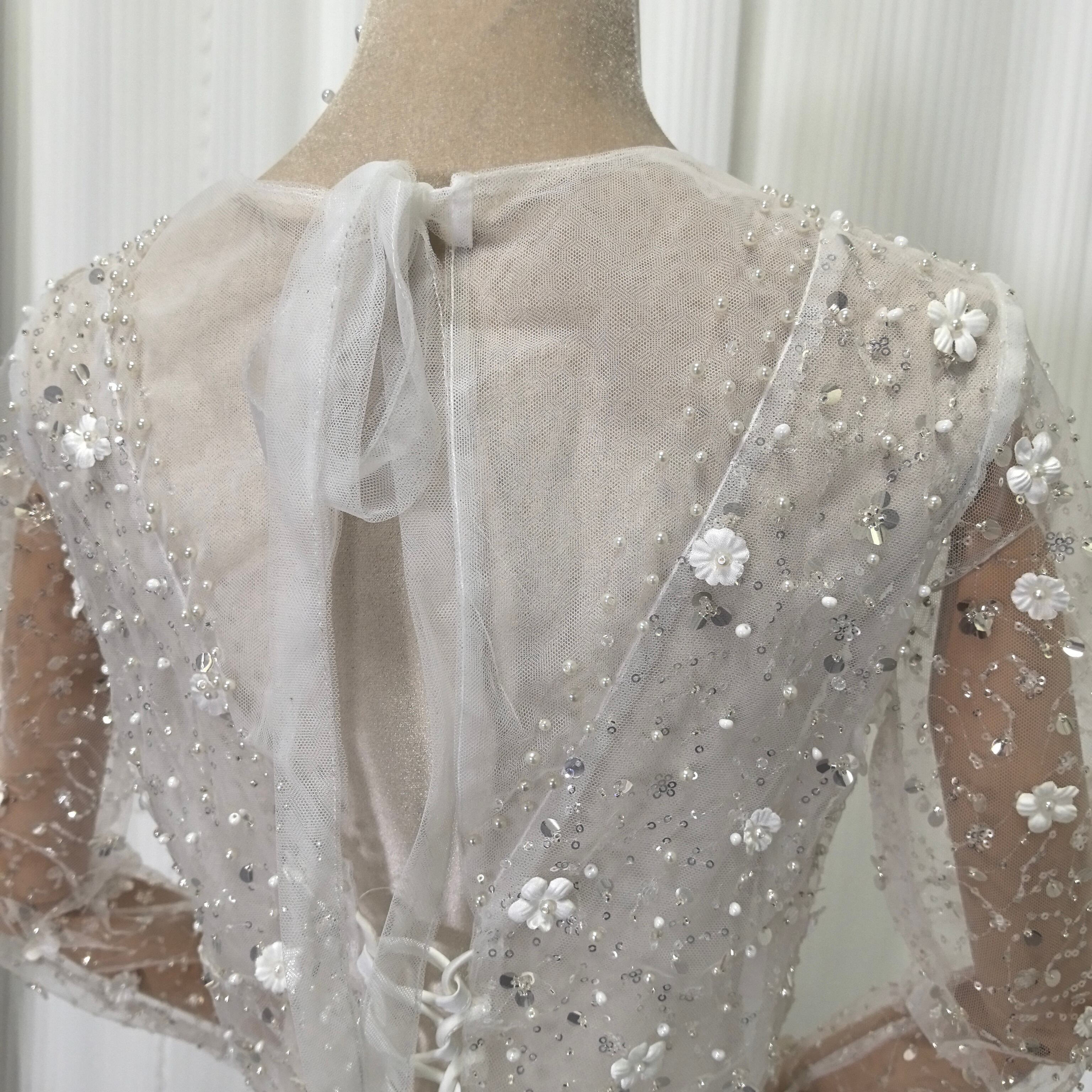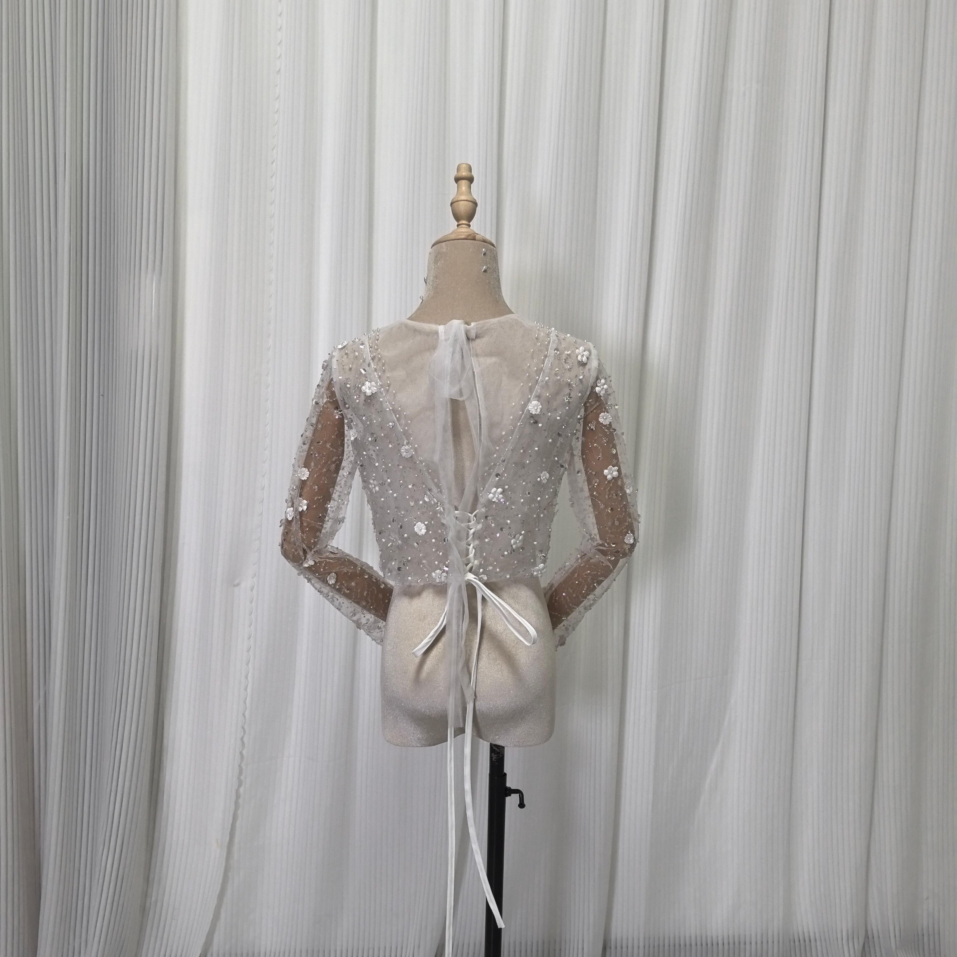 ウエディングドレス オフホワイト Vネック 編み上げ 細見えシルエット 3D立体レース刺繍 トップス 長袖