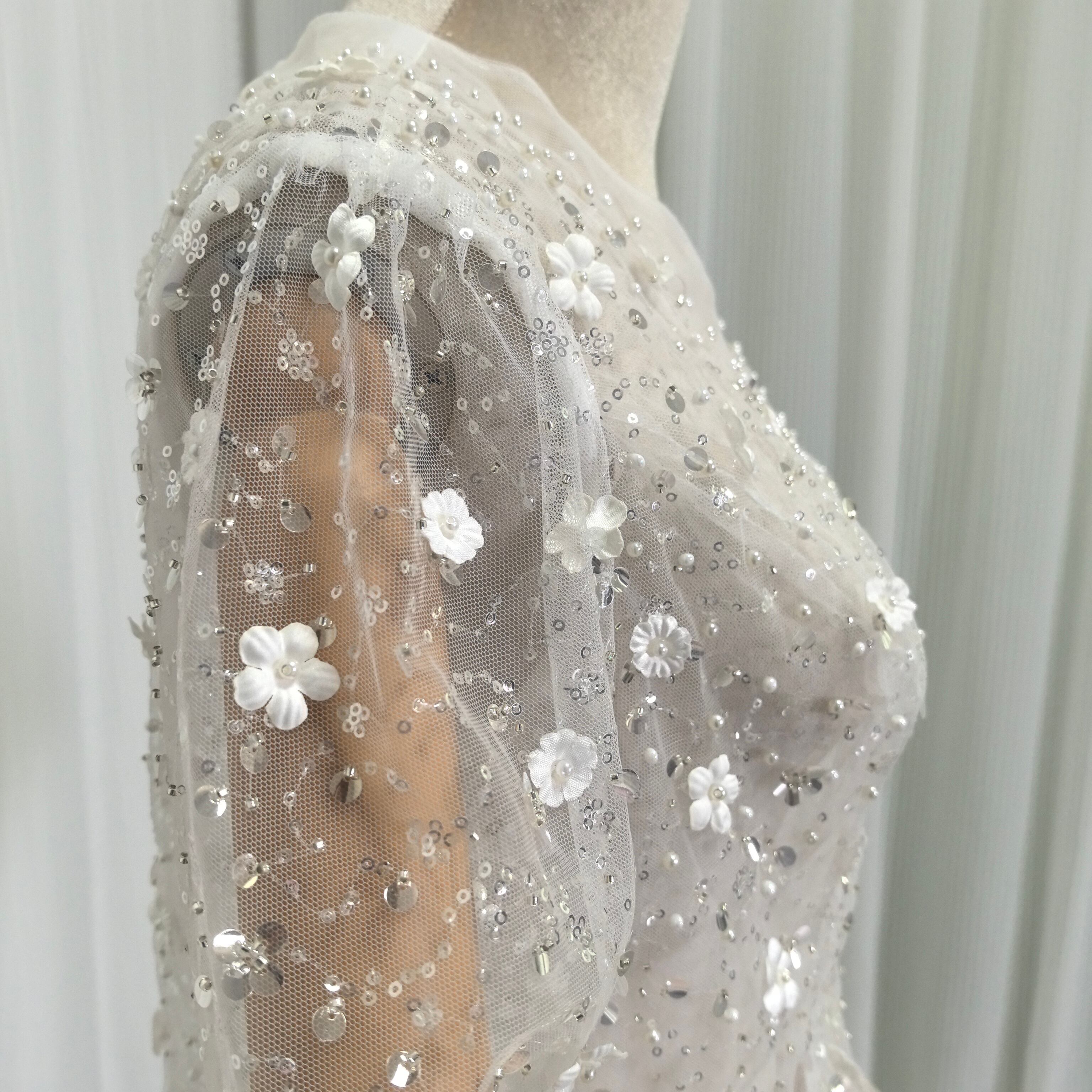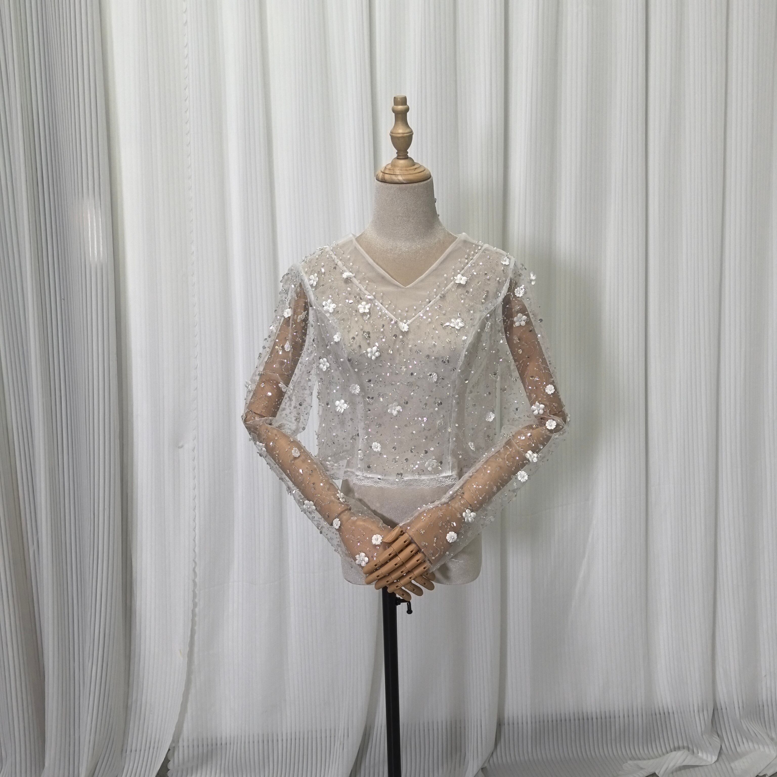 ウエディングドレス ホワイト Vネック くるみボタン 取り外し 3D立体レース刺繍 長袖 トップス