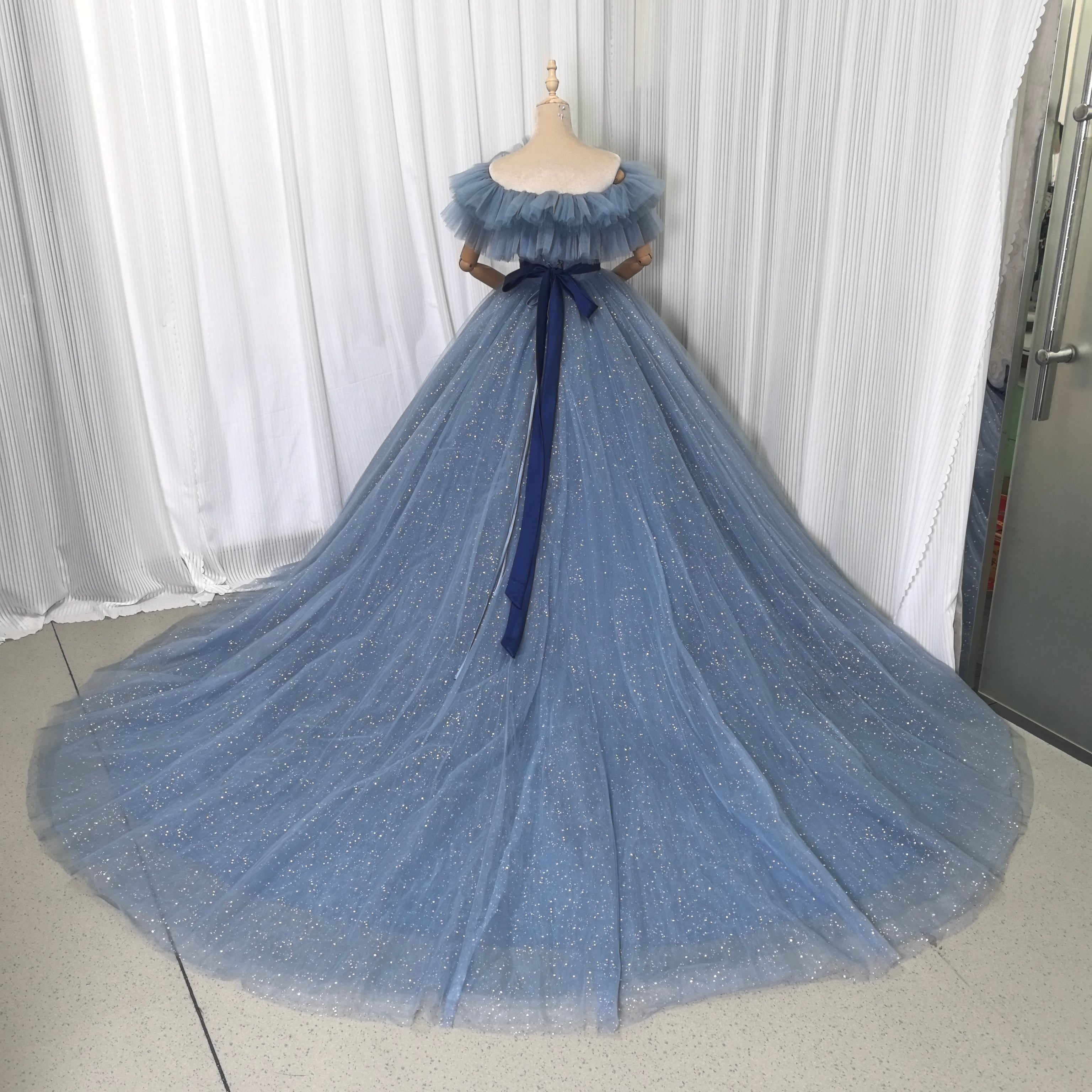 カラードレス 青/ブルー 取り外しオフショルダー 編み上げ キラキラグリッターチュール サッシュベルト 高品質! 結婚式