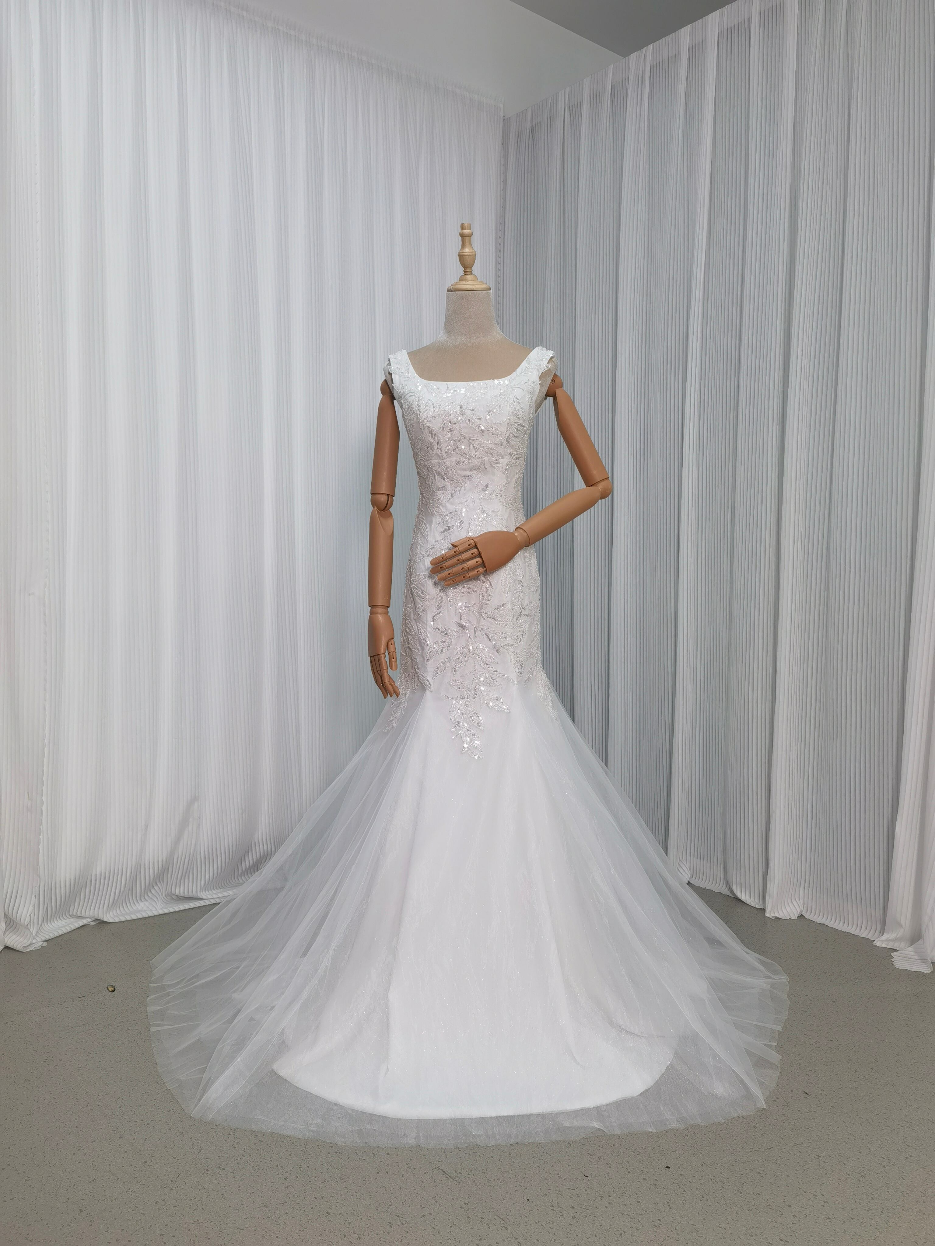 実例写真! ウエディングドレス ホワイト オンショルダードレス ファスナー マーメイドライン 繊細レース 結婚式 トレーン