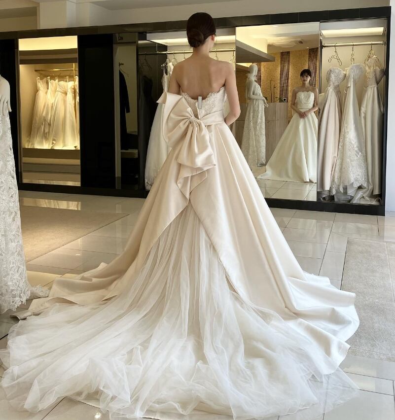 ウエディングドレス オフホワイト ベアトップ エレガント 高品質! 光沢サテン 華やかなトレーン ふっくら柔らかなバックリボン