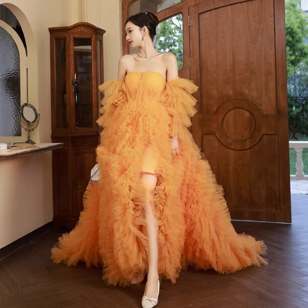 カラードレス オレンジ ソフトチュール オフショルダー 編み上げ 華やかなトレーン ロングスリーブ 演奏会/音楽会/発表会など