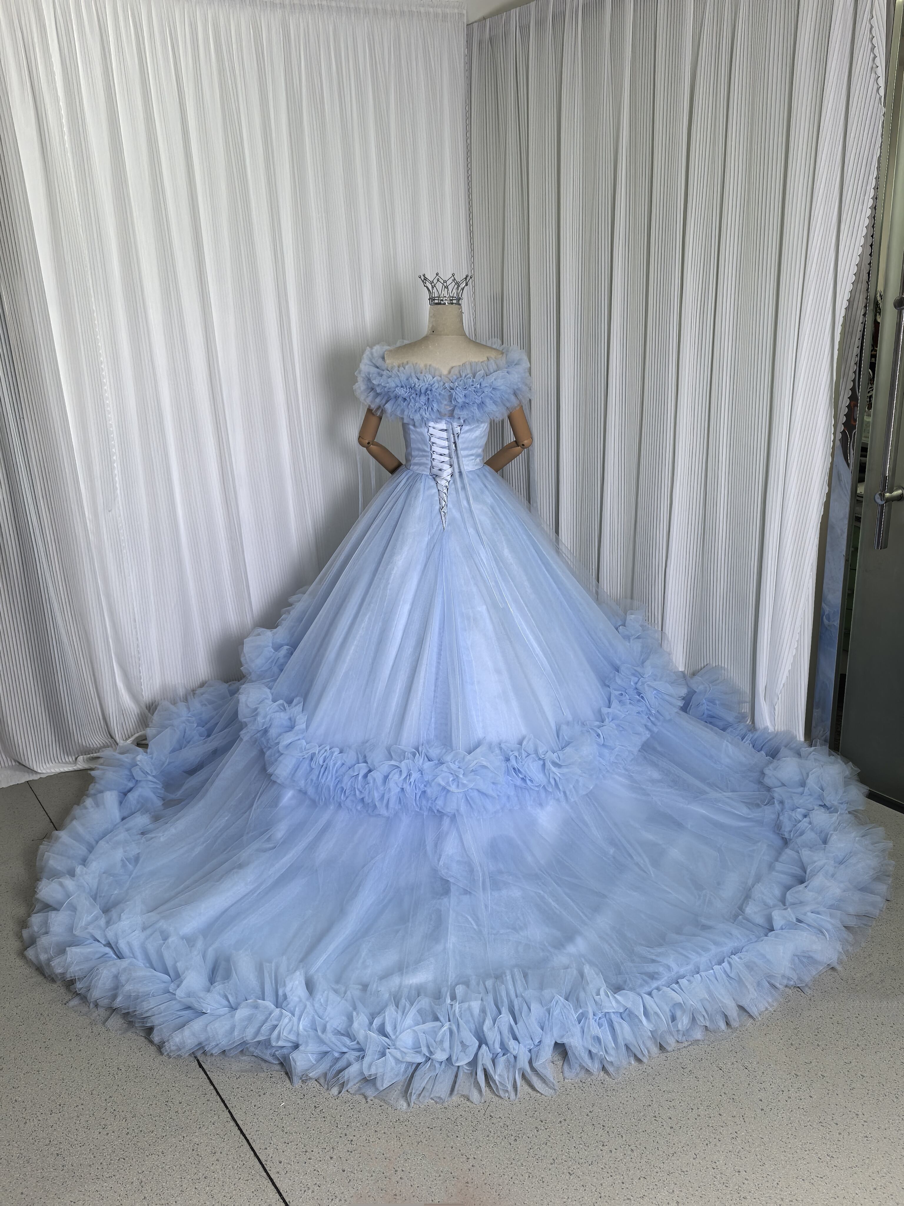 実例写真!カラードレス 爽やかで優しいブルー 結婚式 取り外しオフショルダー 編み上げ 柔らかく重ねたチュールスカート レイヤードドレス