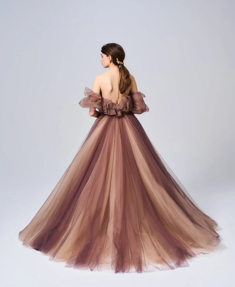 カラードレス 茶 オフショルダー バックレス アンティークなドレス 演奏会/音楽会/発表会など 柔らかく重ねたチュールスカート