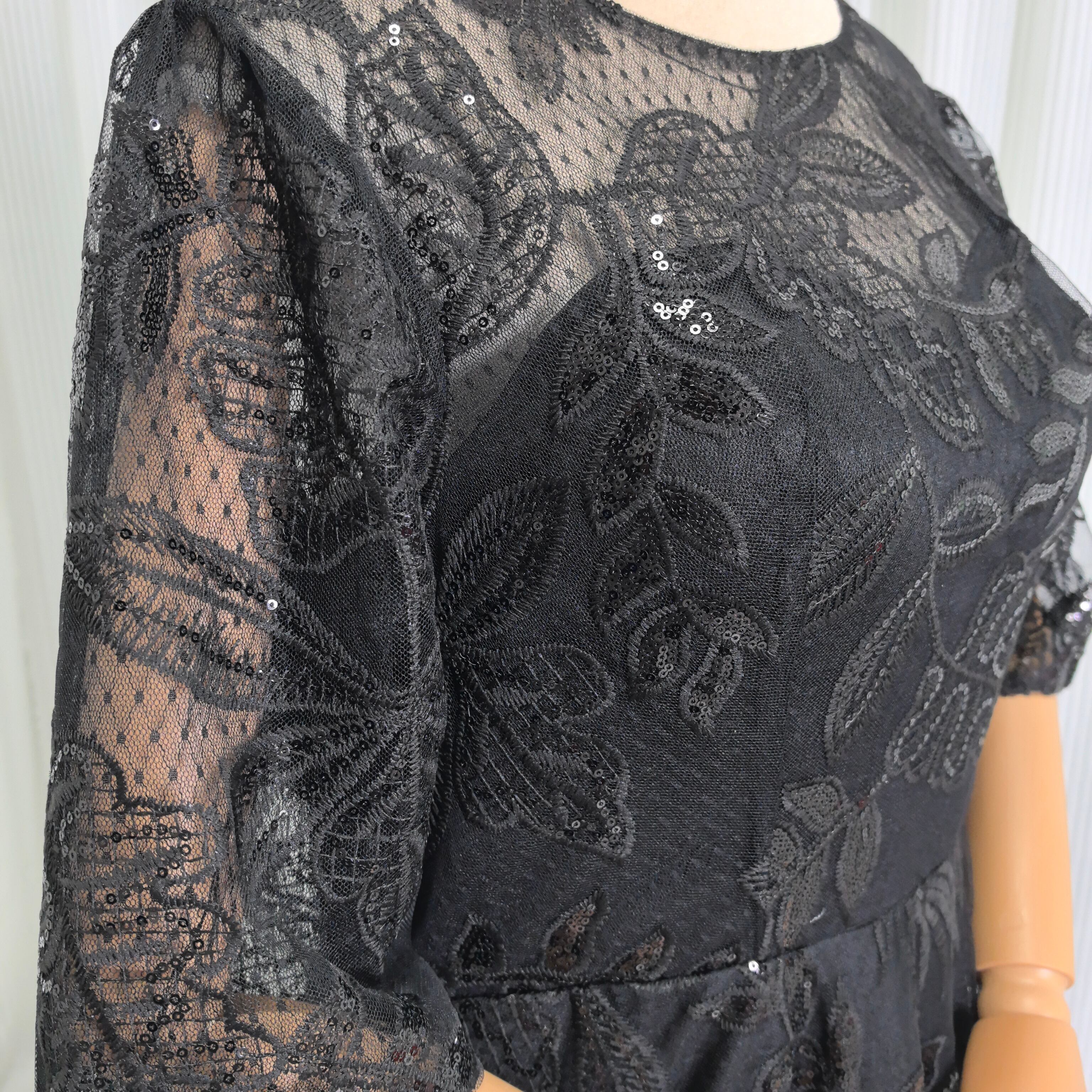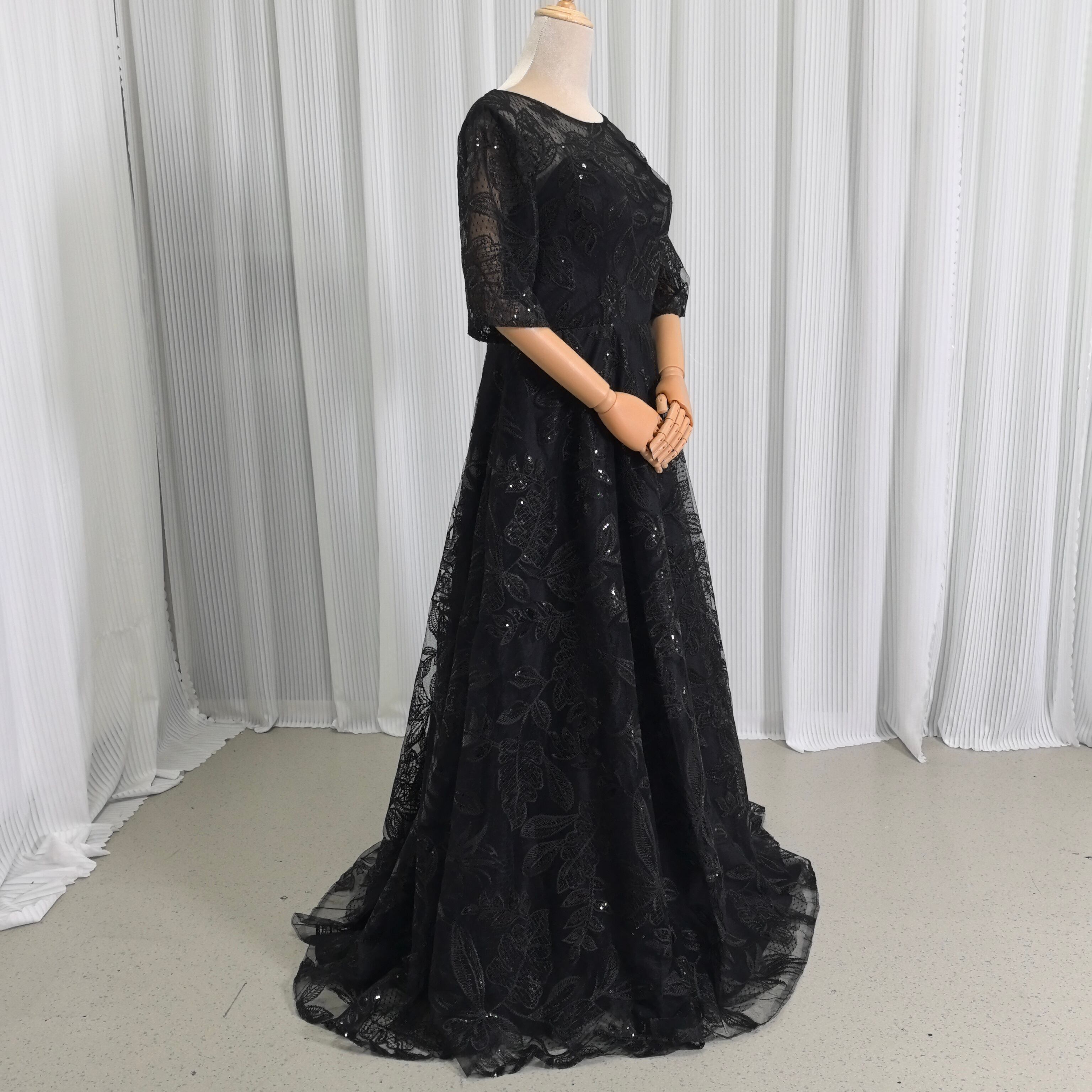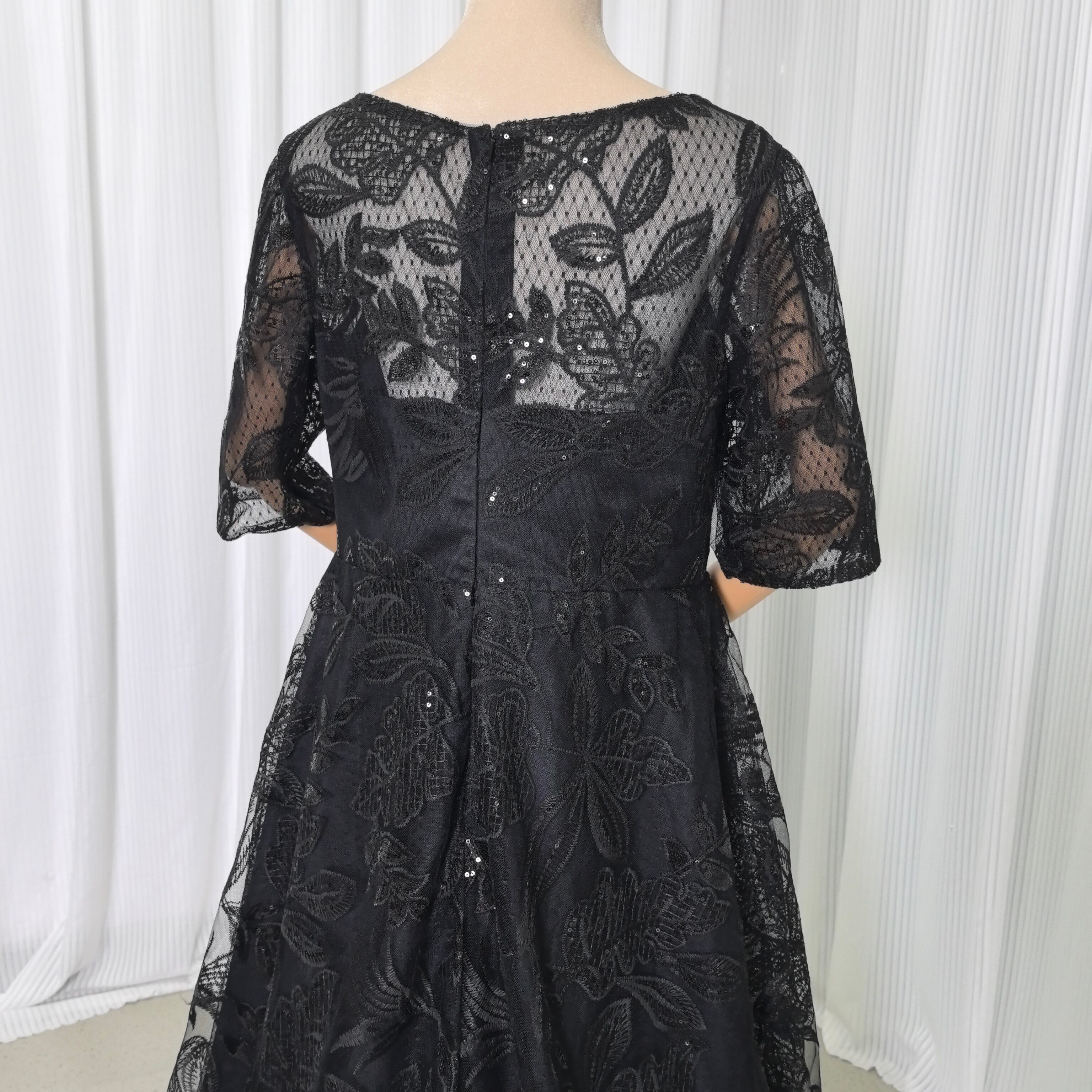 カラードレス ブラック クルーネック ファスナー 半袖 総レース トレーン 演奏会/音楽会/発表会など