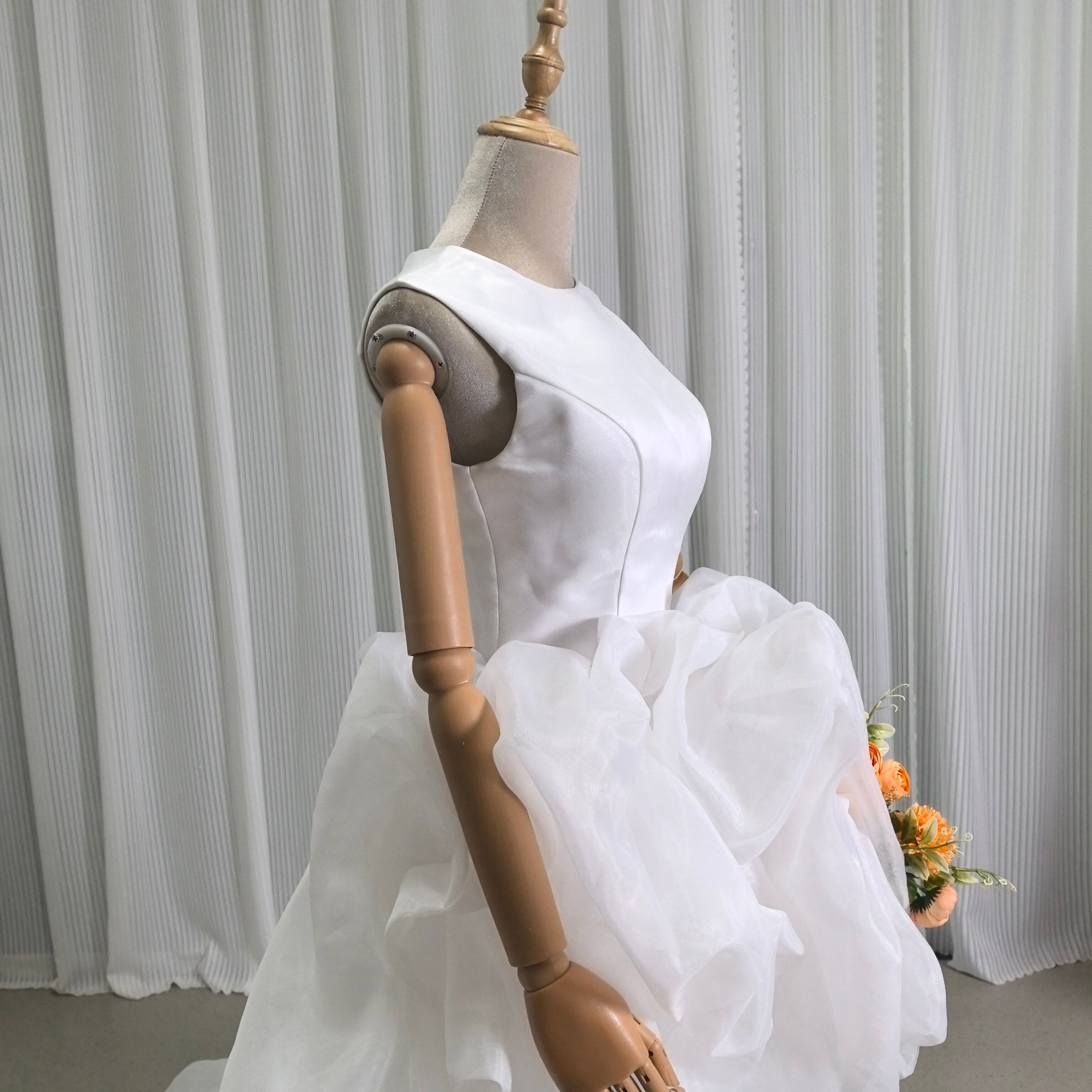 ウエディングドレス ホワイト ノースリーブ バックレス ファスナー ラウンドネック リボントレーン