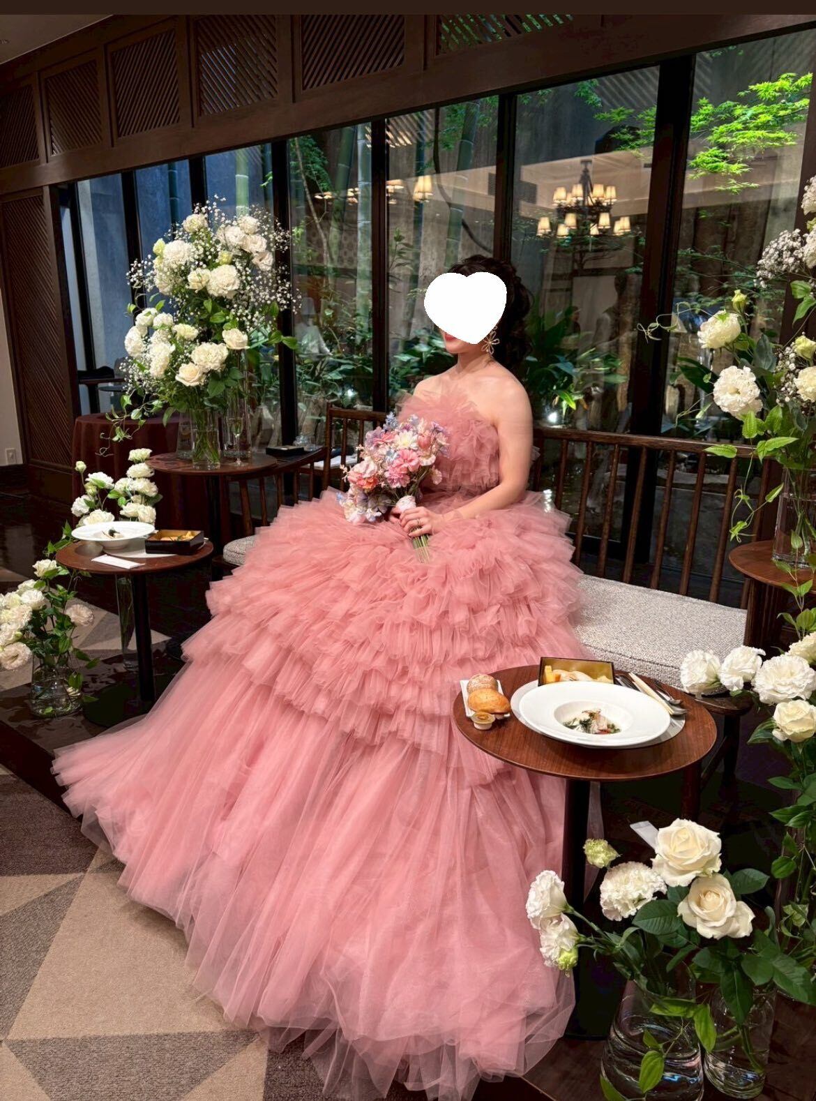 実例写真! カラードレス ピンク 結婚式 ブライダル ベアトップ サッシュベルト 華やかなトレーン ティアードのドレス