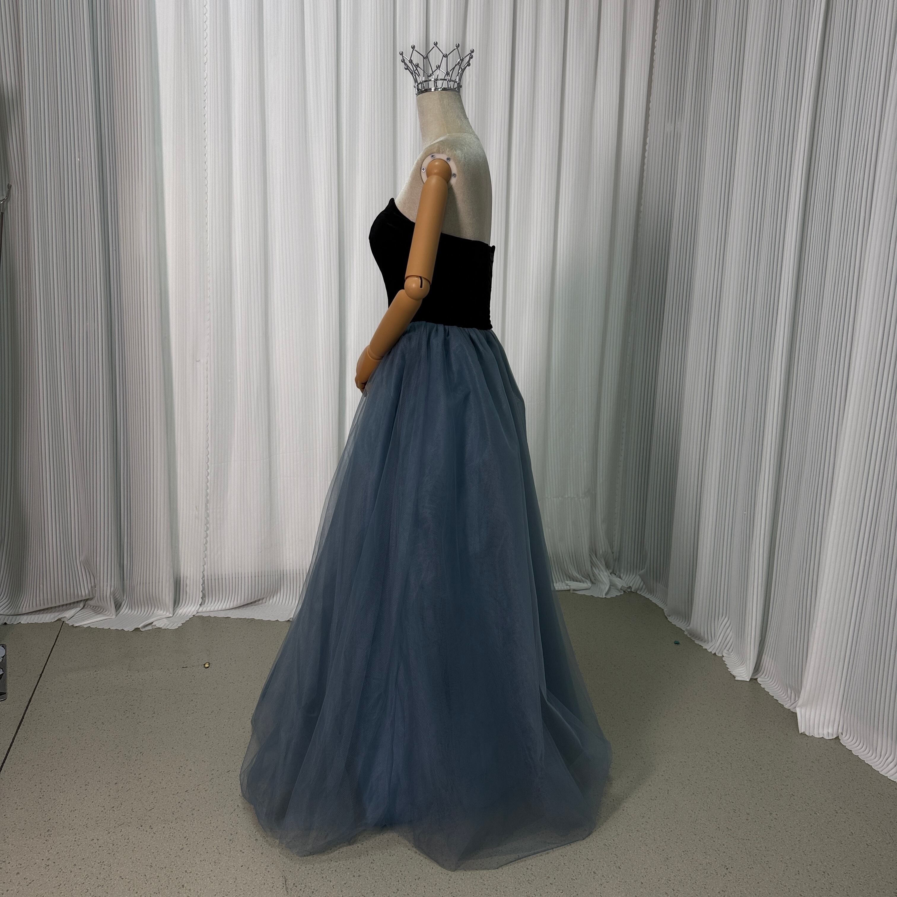 カラードレス ブルーグレー ベアトップ エレガント ソフトチュール ビスチェタイプ ロング