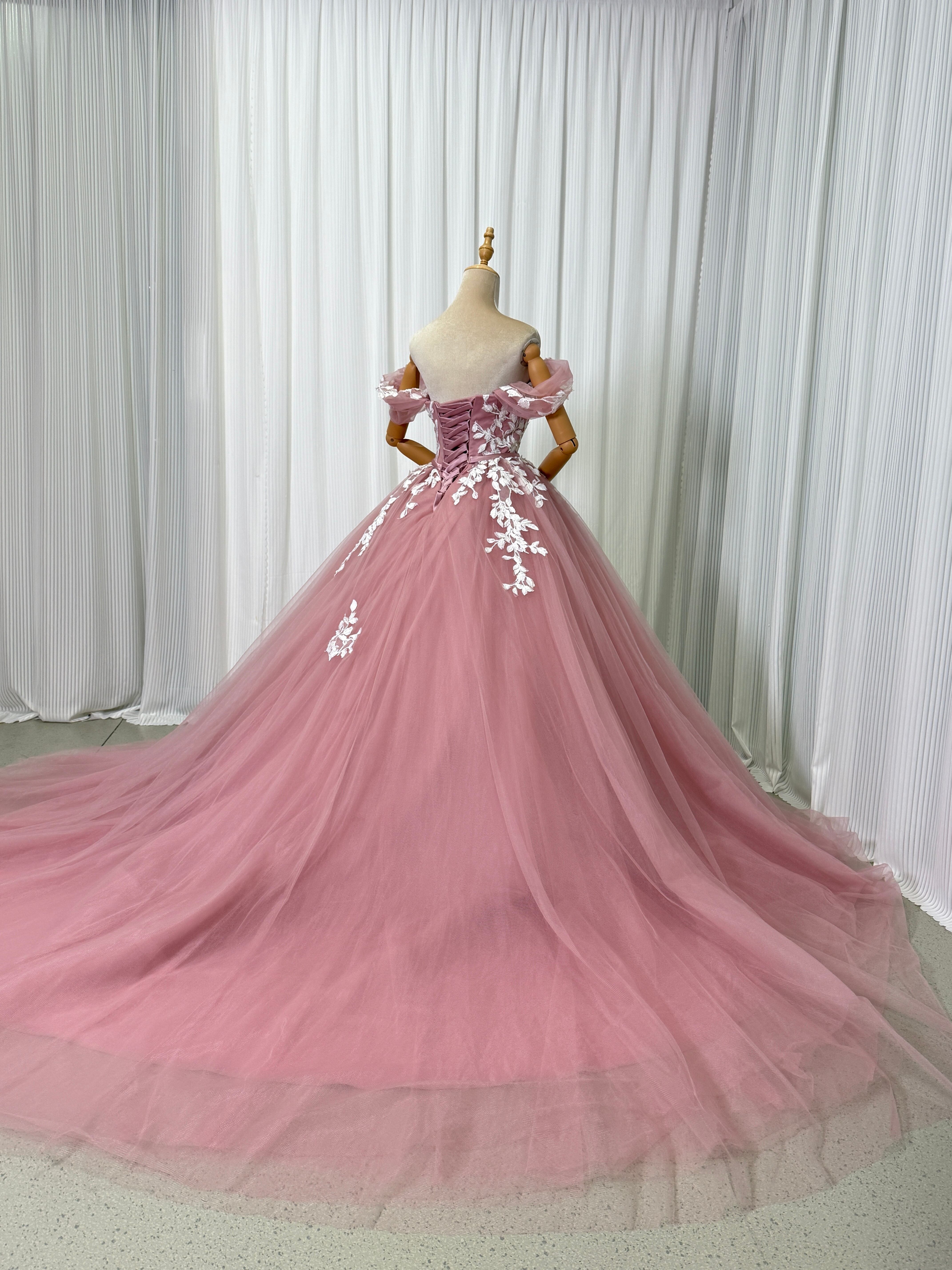 カラードレス ピンク オフショルダー 編み上げ 3D立体レース刺繍 プリンセスライン 華やかなトレーン