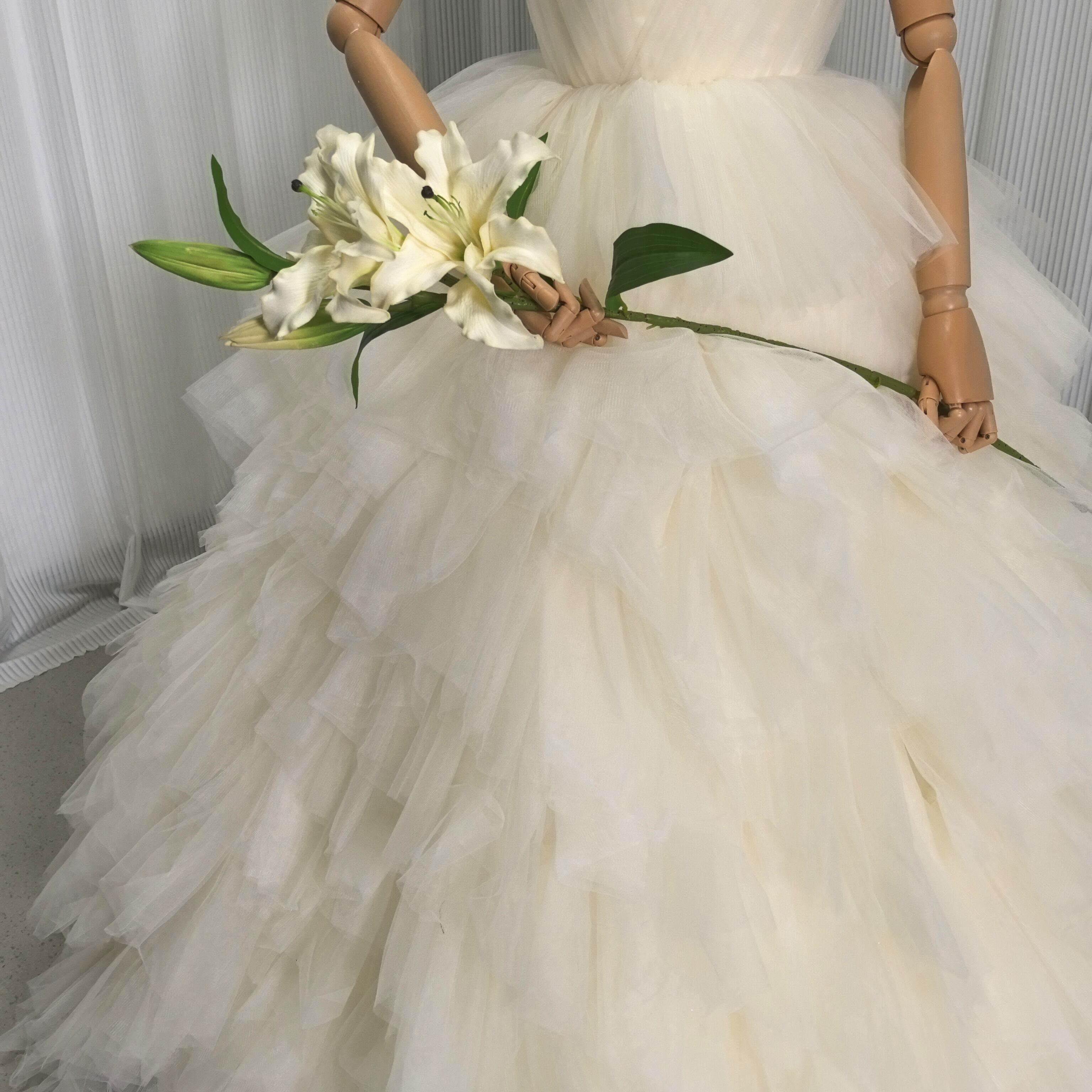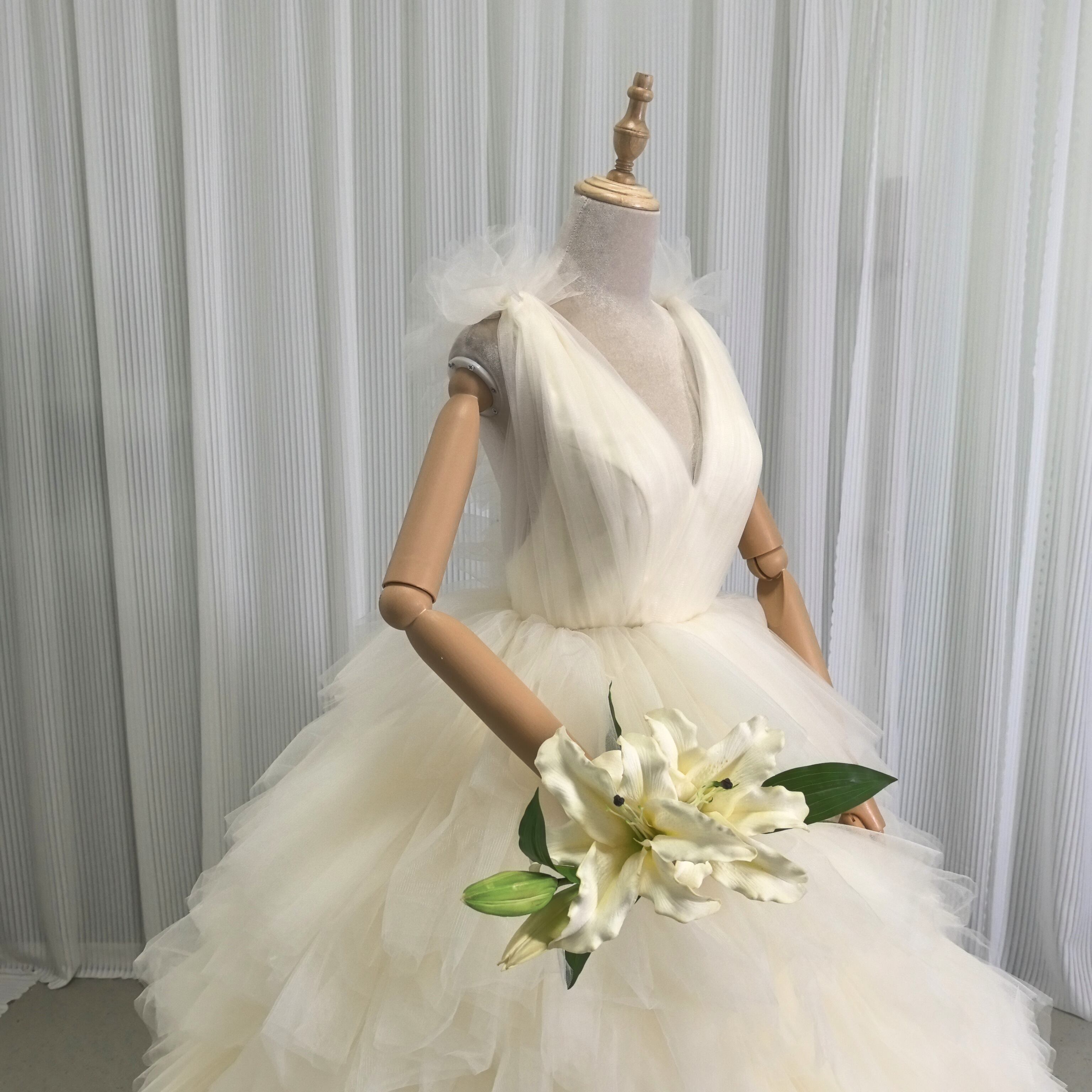 ウエディングドレス オフホワイト オンショルダードレス Vネックドレス ソフトチュール 柔らかく重ねたチュールスカート
