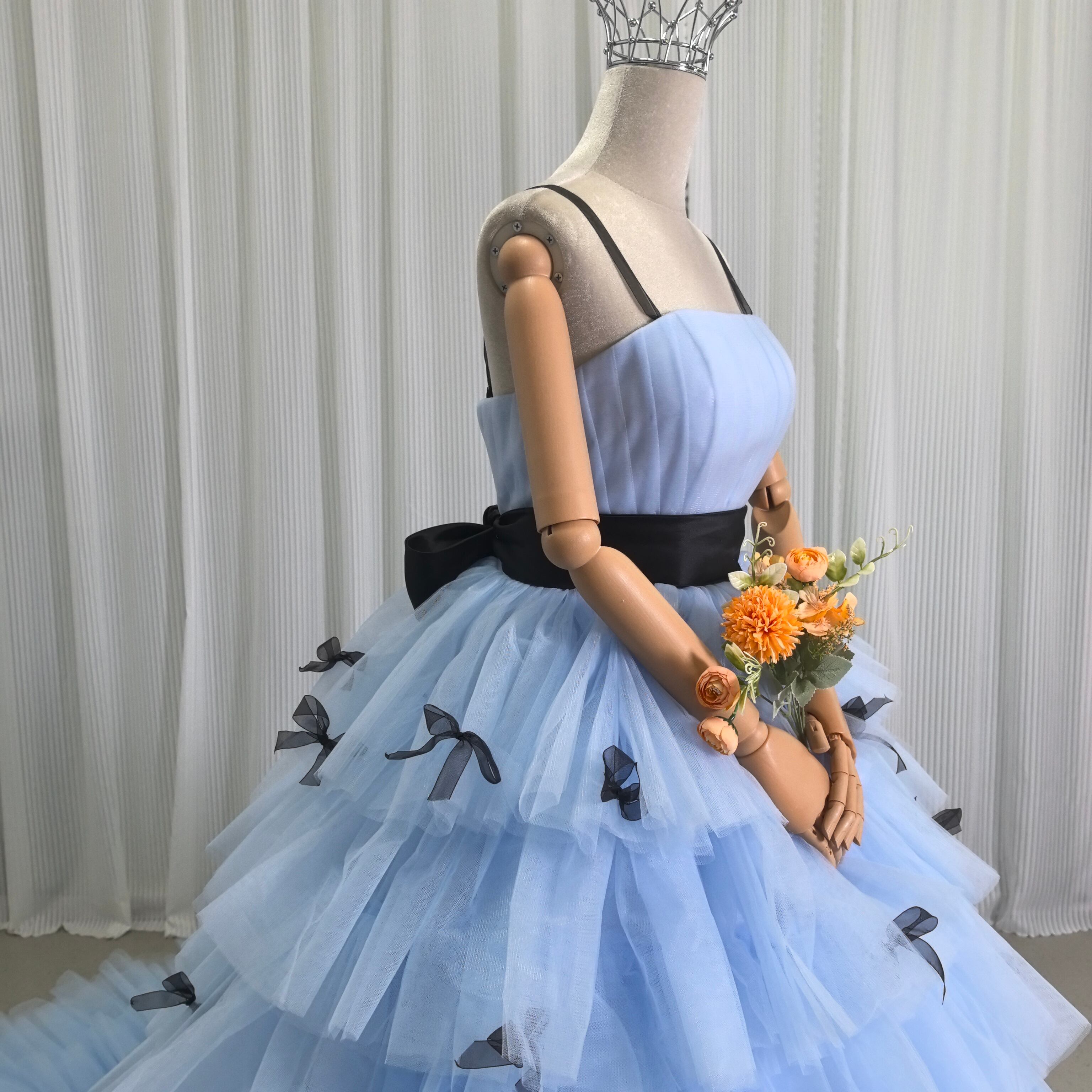 カラードレス 爽やかで優しいブルー キャミソール リボン サッシュベルト ビスチェタイプ 柔らかく重ねたチュールスカート のコピー