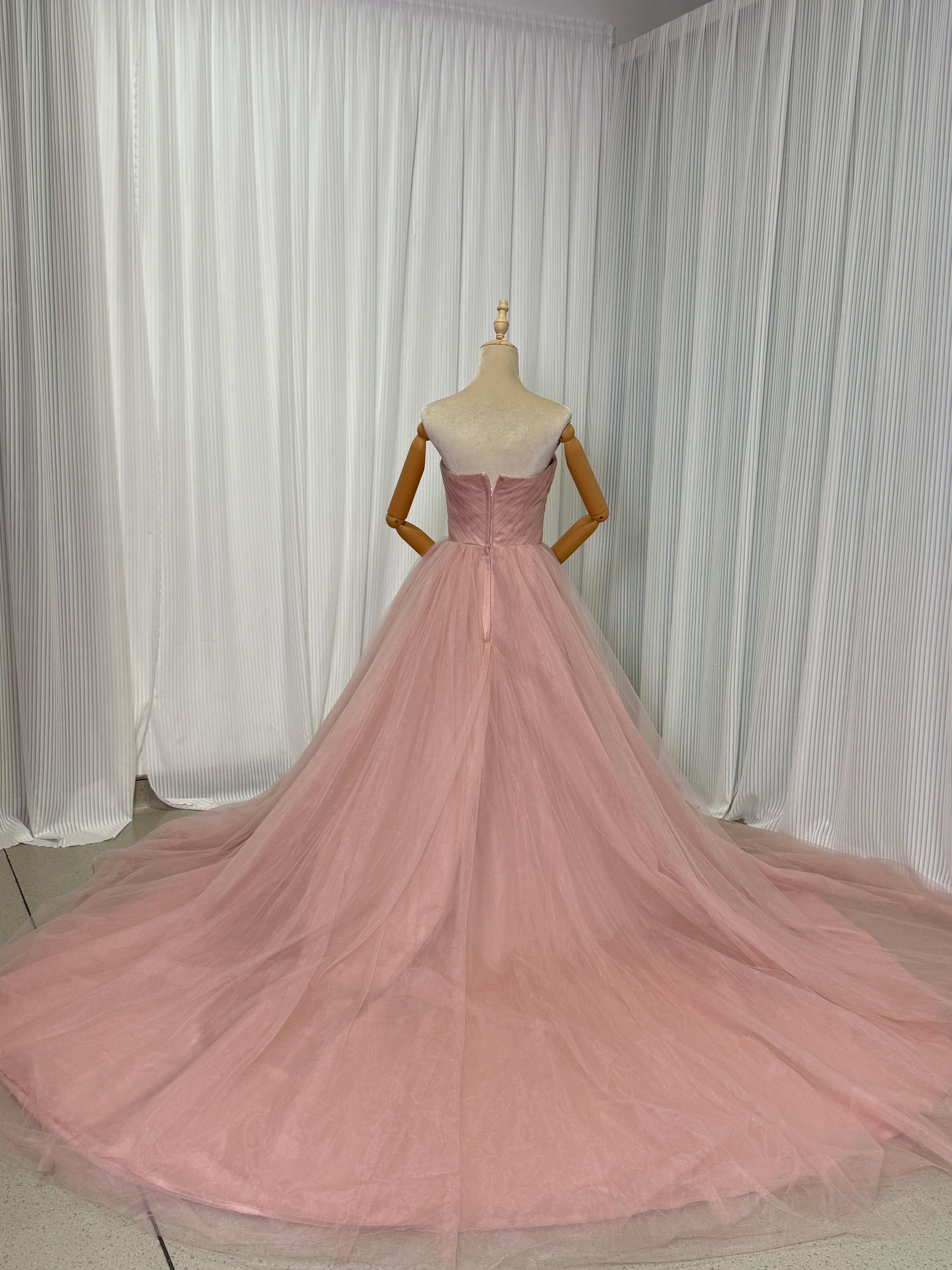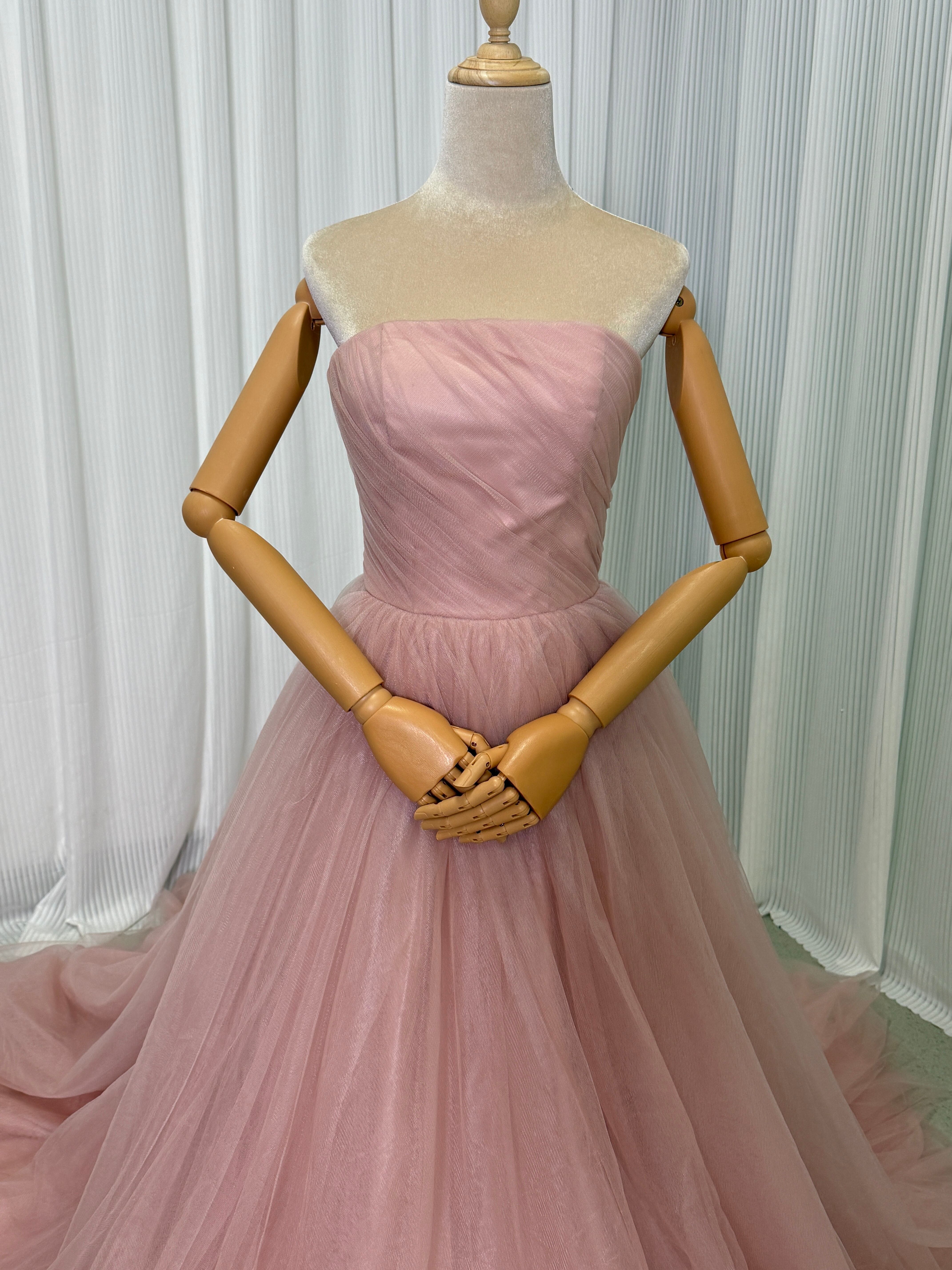 カラードレス ピンク チューブトップ バックレス ファスナー ソフトチュール エレガント ロングトレーン