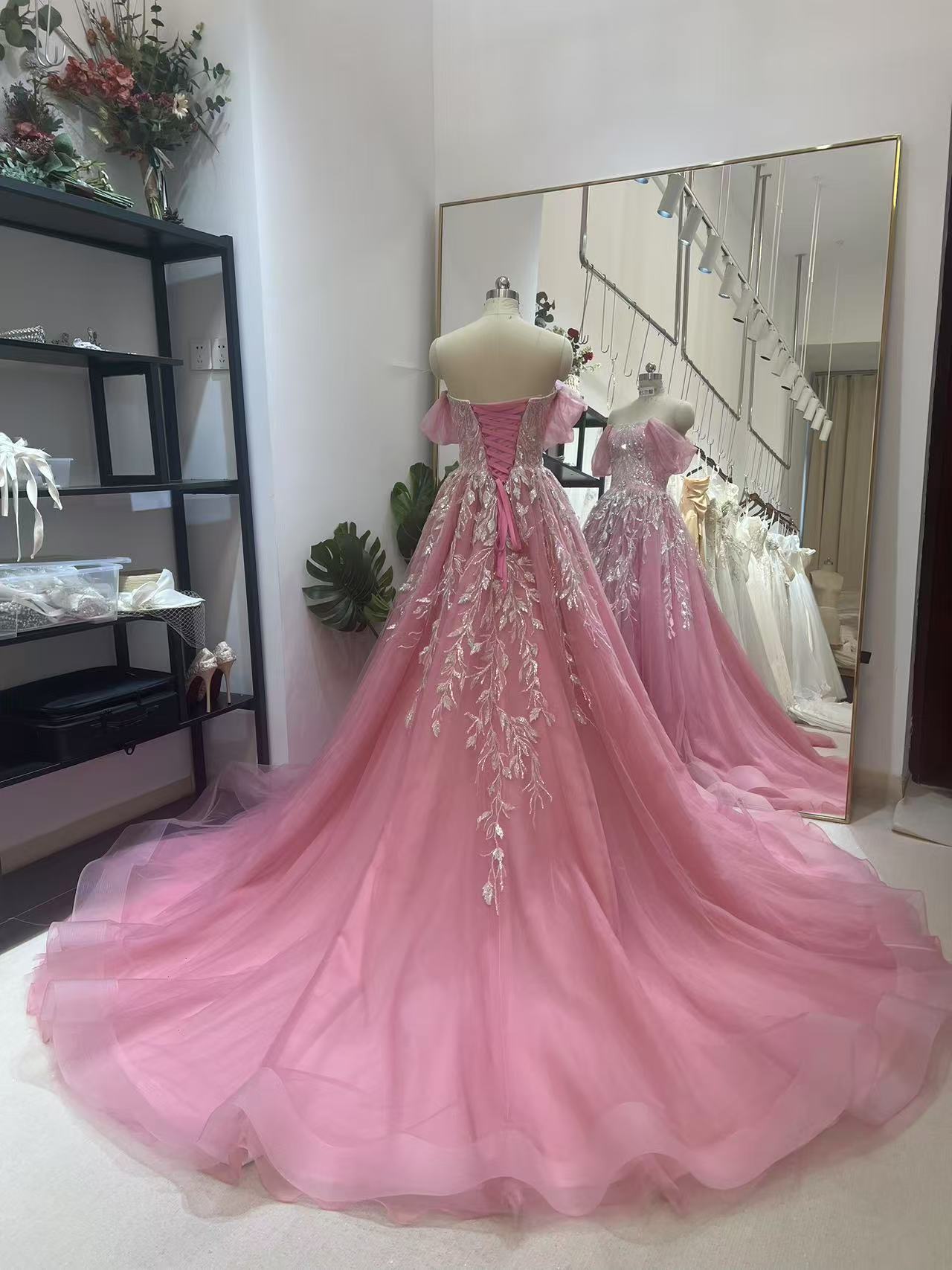 カラードレス ピンク オフショルダー 編み上げ ふっくら柔らかなバックリボン ビジュー エレガント 華やかなトレーン