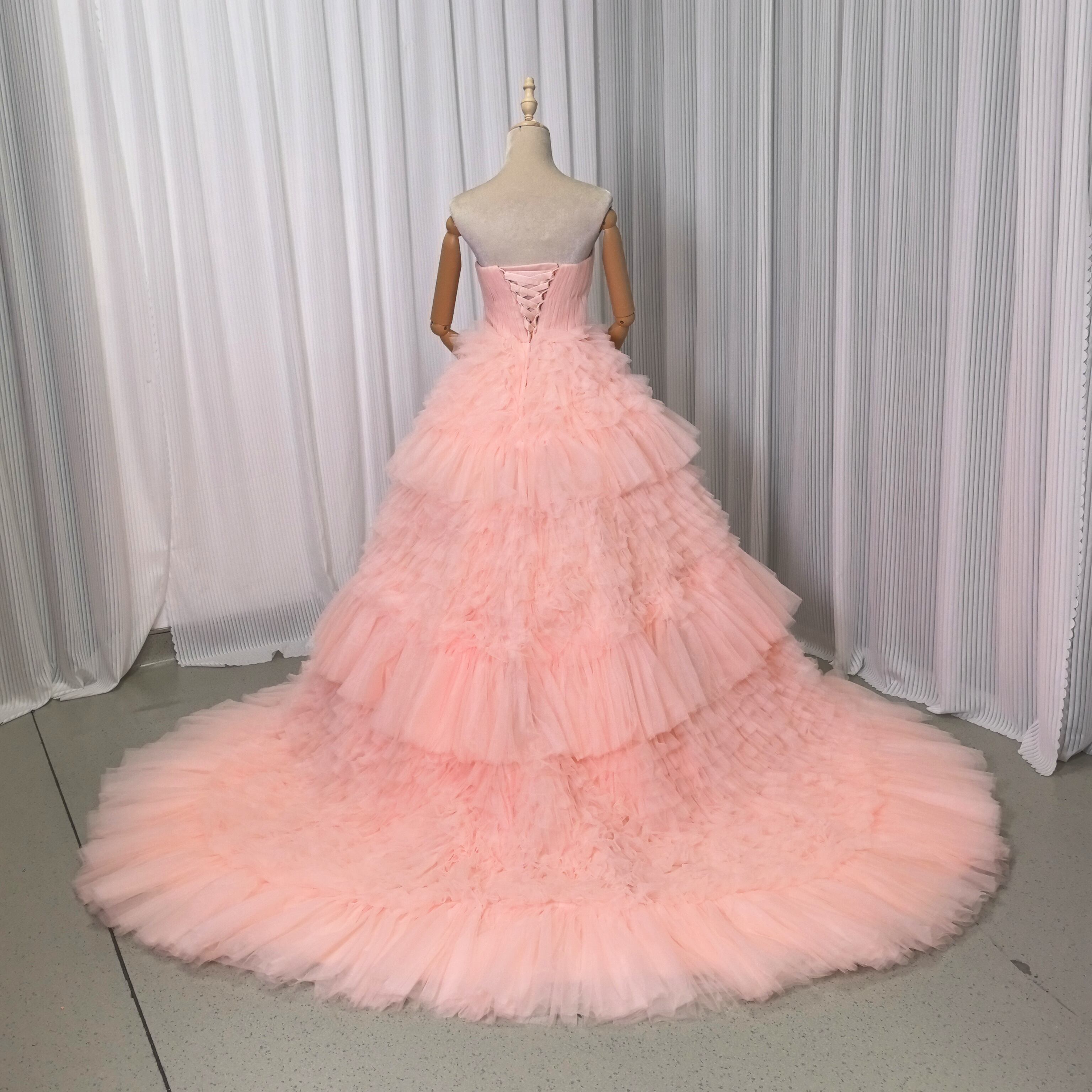 カラードレス コーラルピンク ベアトップ プリンセスライン 編み上げ 華やかなトレーン 柔らかく重ねたチュールスカート