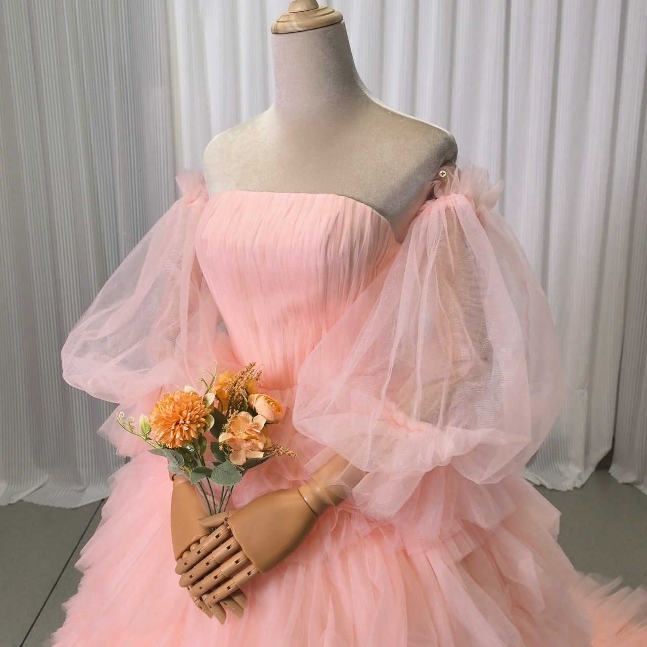 カラードレス コーラルピンク ベアトップ プリンセスライン 編み上げ 華やかなトレーン 柔らかく重ねたチュールスカート 取り外し袖 取り外しオフショルダー