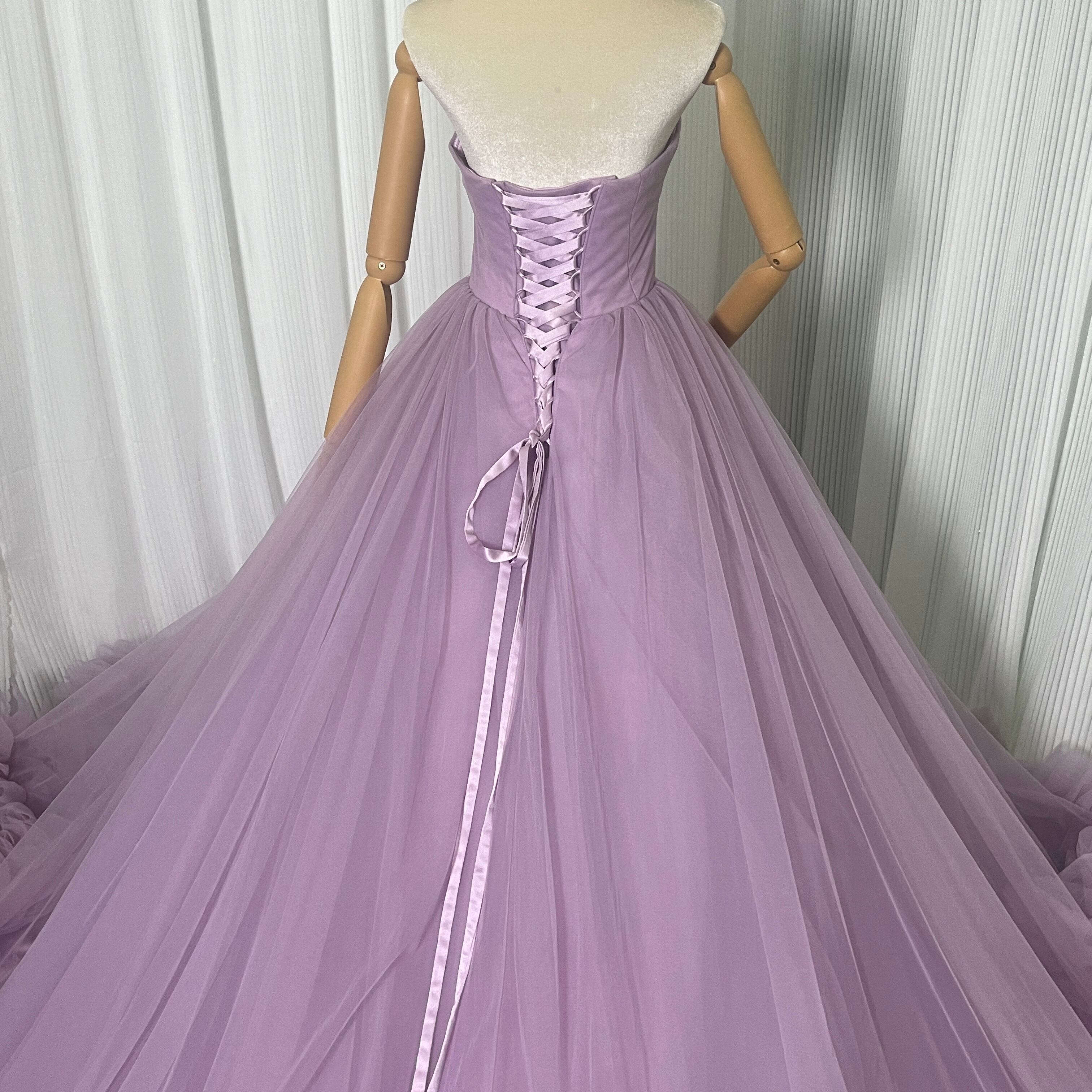 カラードレス パープル ベアトップ ビスチェタイプ ソフトチュール リボントレーン フレアスカート