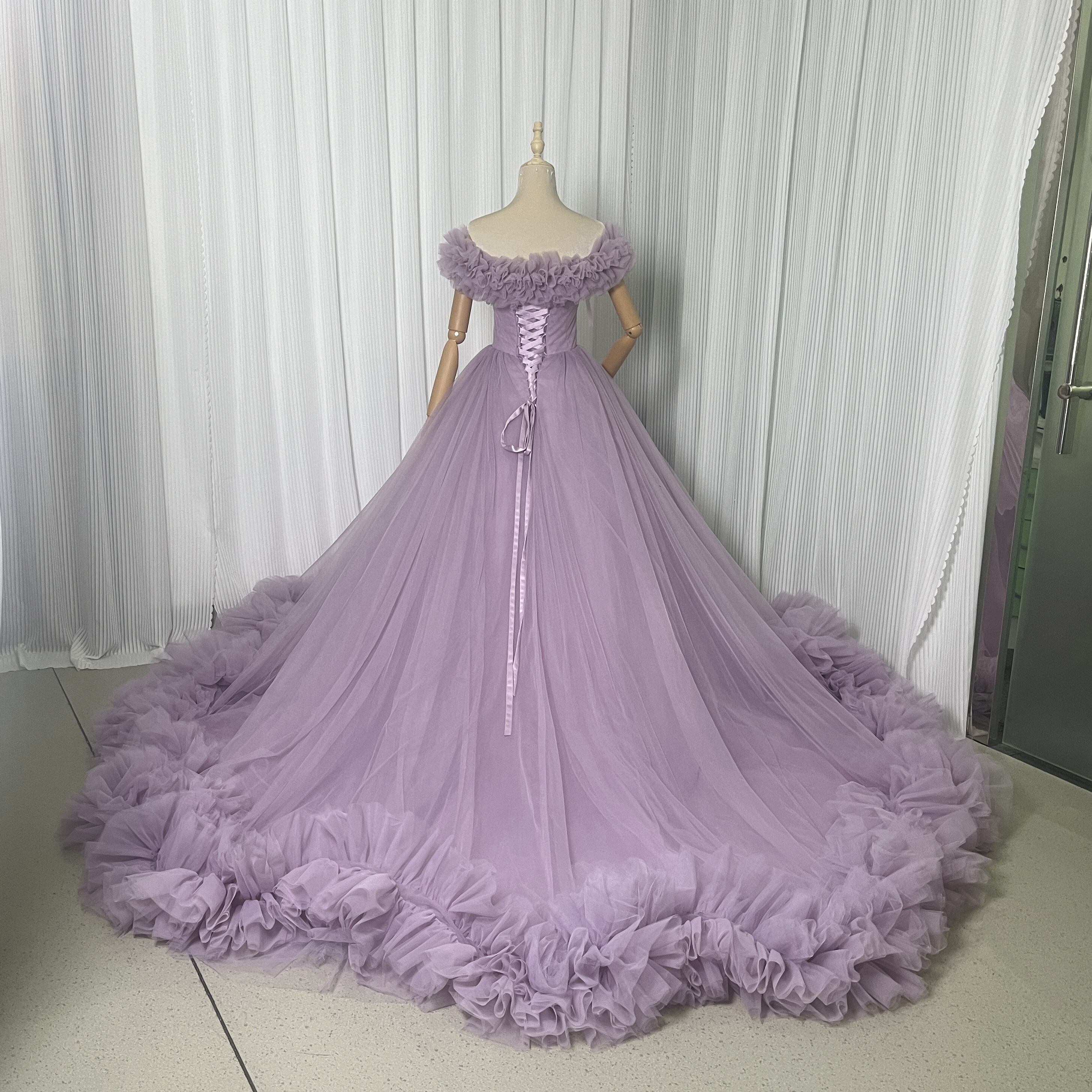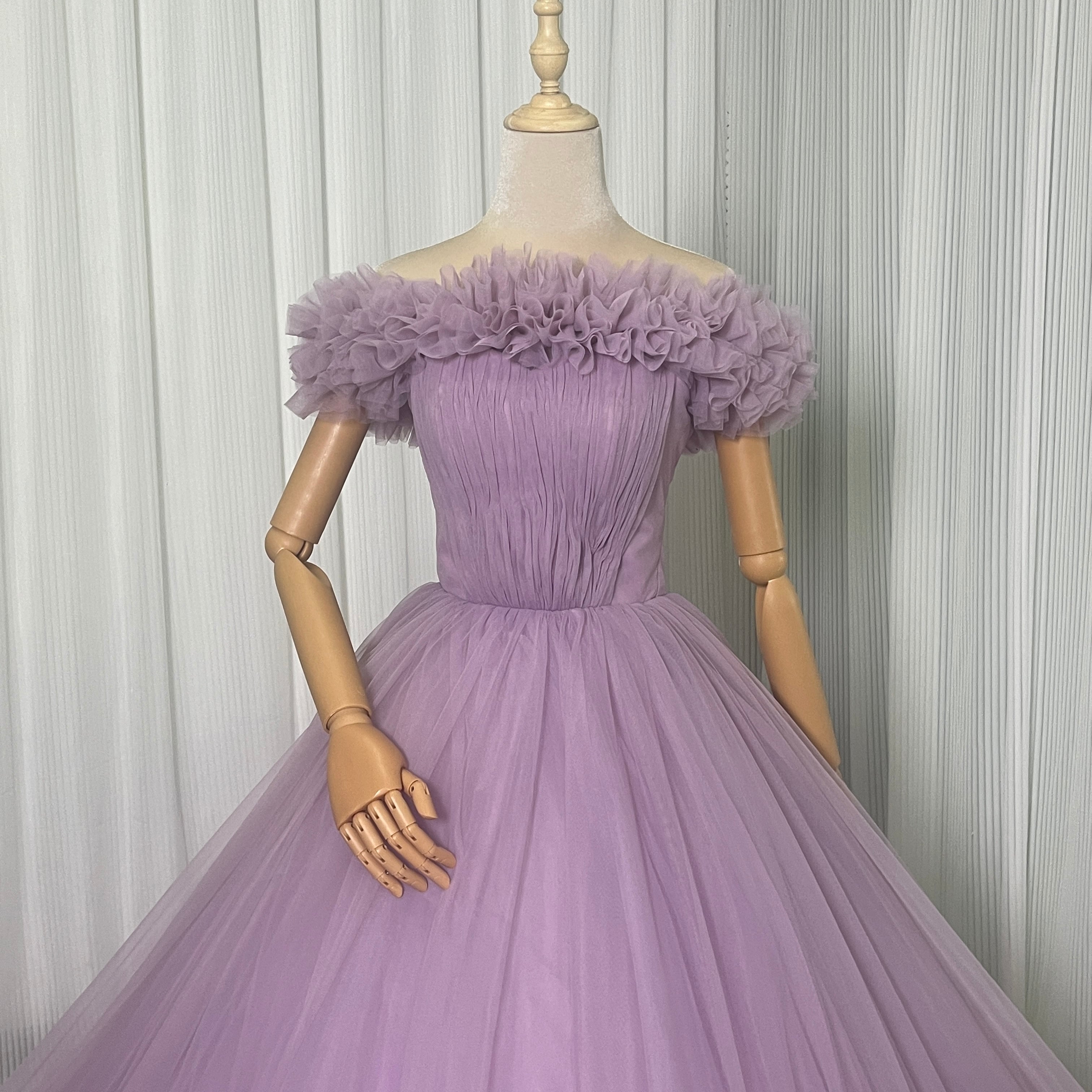 カラードレス パープル ベアトップ ビスチェタイプ ソフトチュール リボントレーン 取り外しオフショルダー フレアスカート