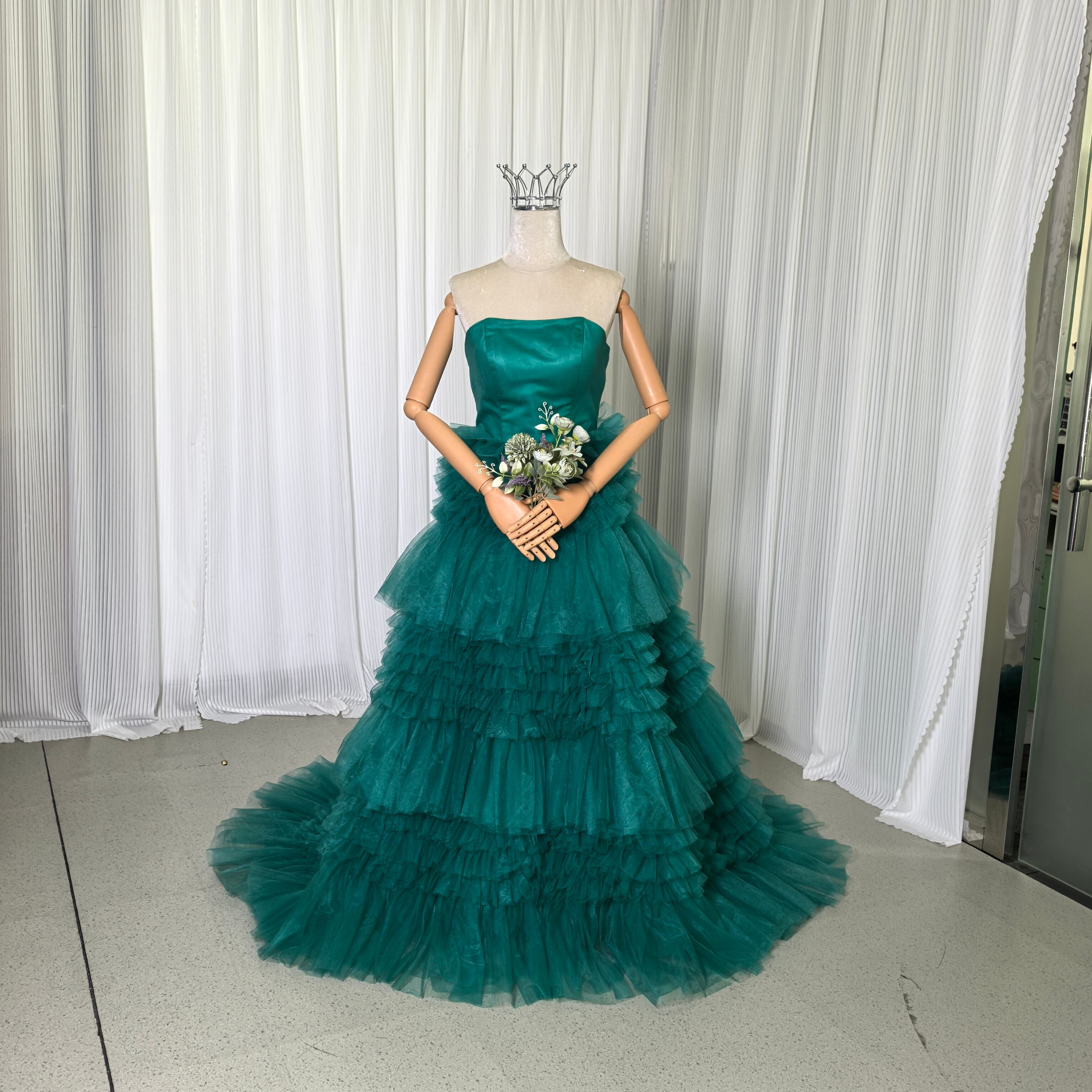 カラードレス グリーン ベアトップ ビスチェタイプ アンティークなドレス ソフトチュール フレアスカート