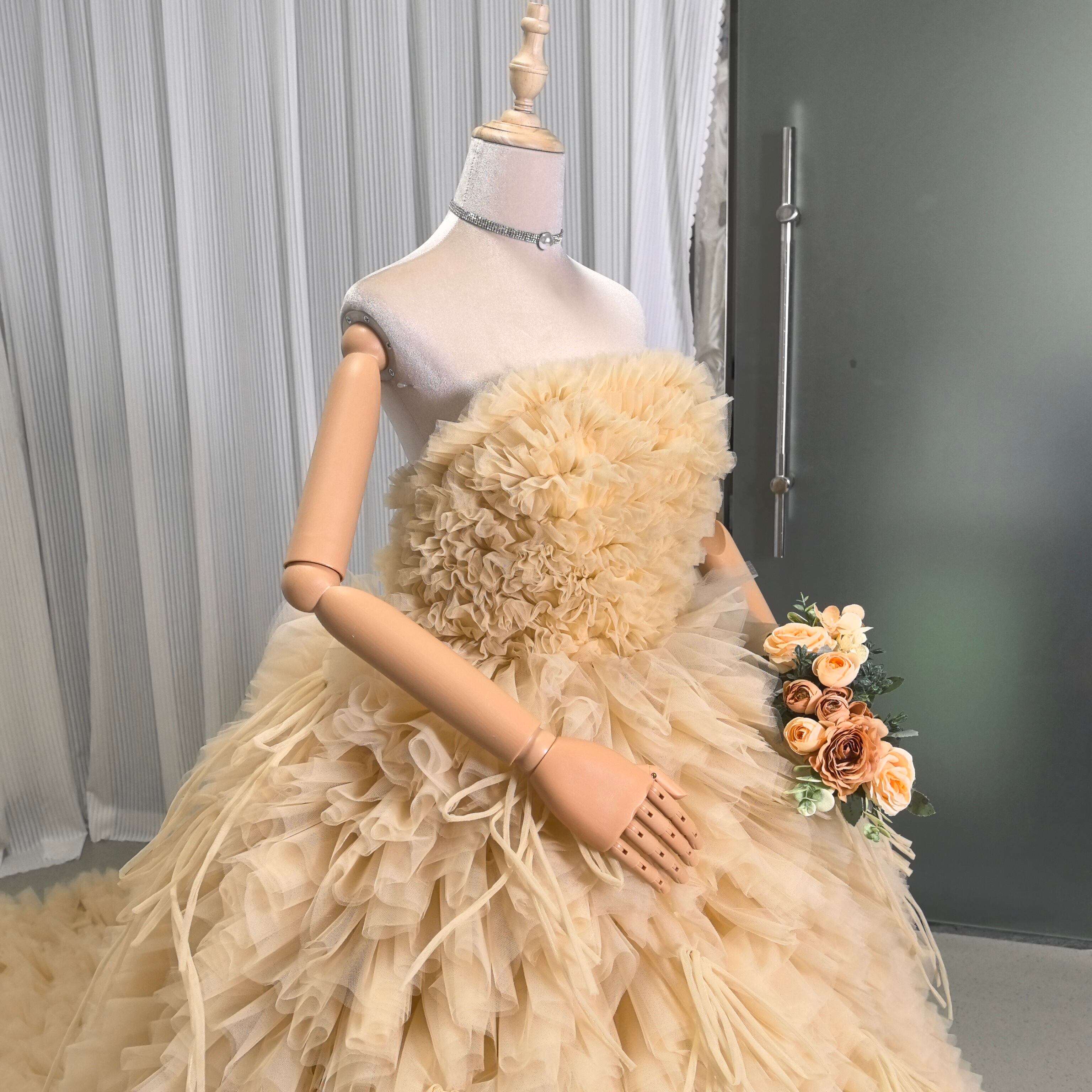 ウエディングドレス イエロー フランス風 チューブトップ 上品! 憧れのドレス 花嫁 華やかなトレーン フレアスカート