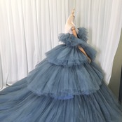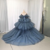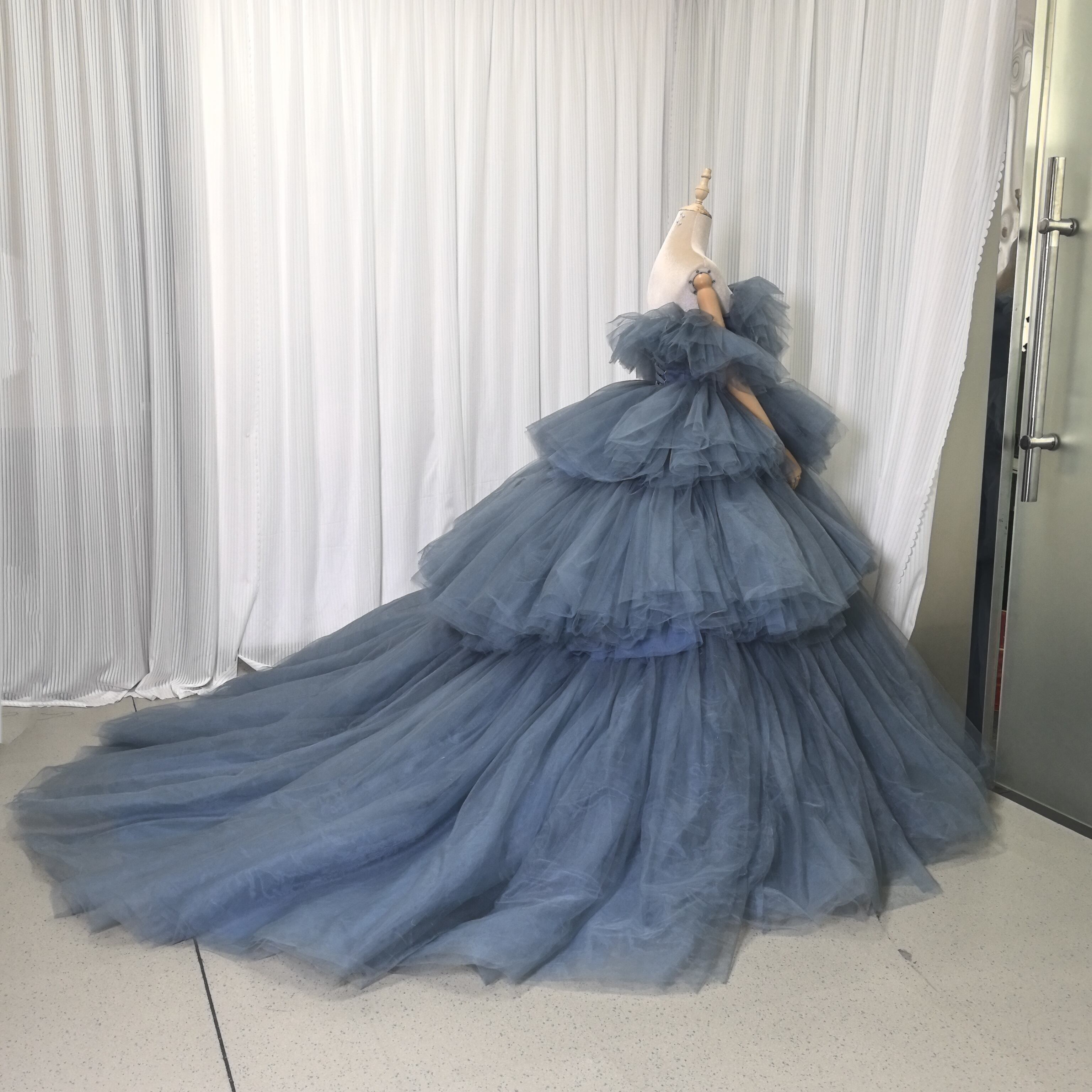 ウエディングドレス ブルーグレー オフショルダー 編み上げ 花嫁 柔らかく重ねたチュールスカート 華やかなトレーン フレアスカート