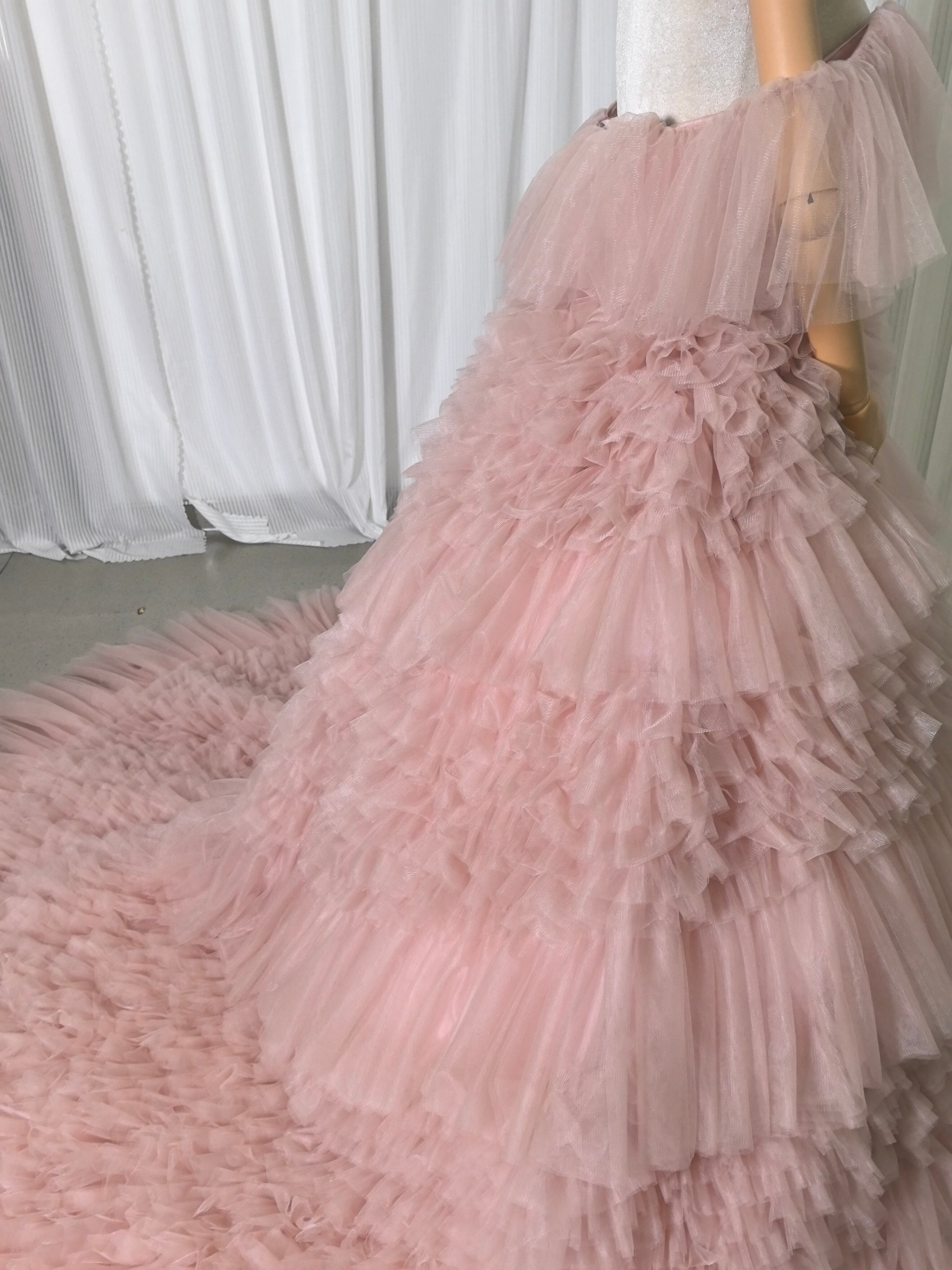 ウエディングドレス ピンク オフショルダー プリンセスライン レイヤードドレス 華やかなトレーン ソフトチュール フレアスカート