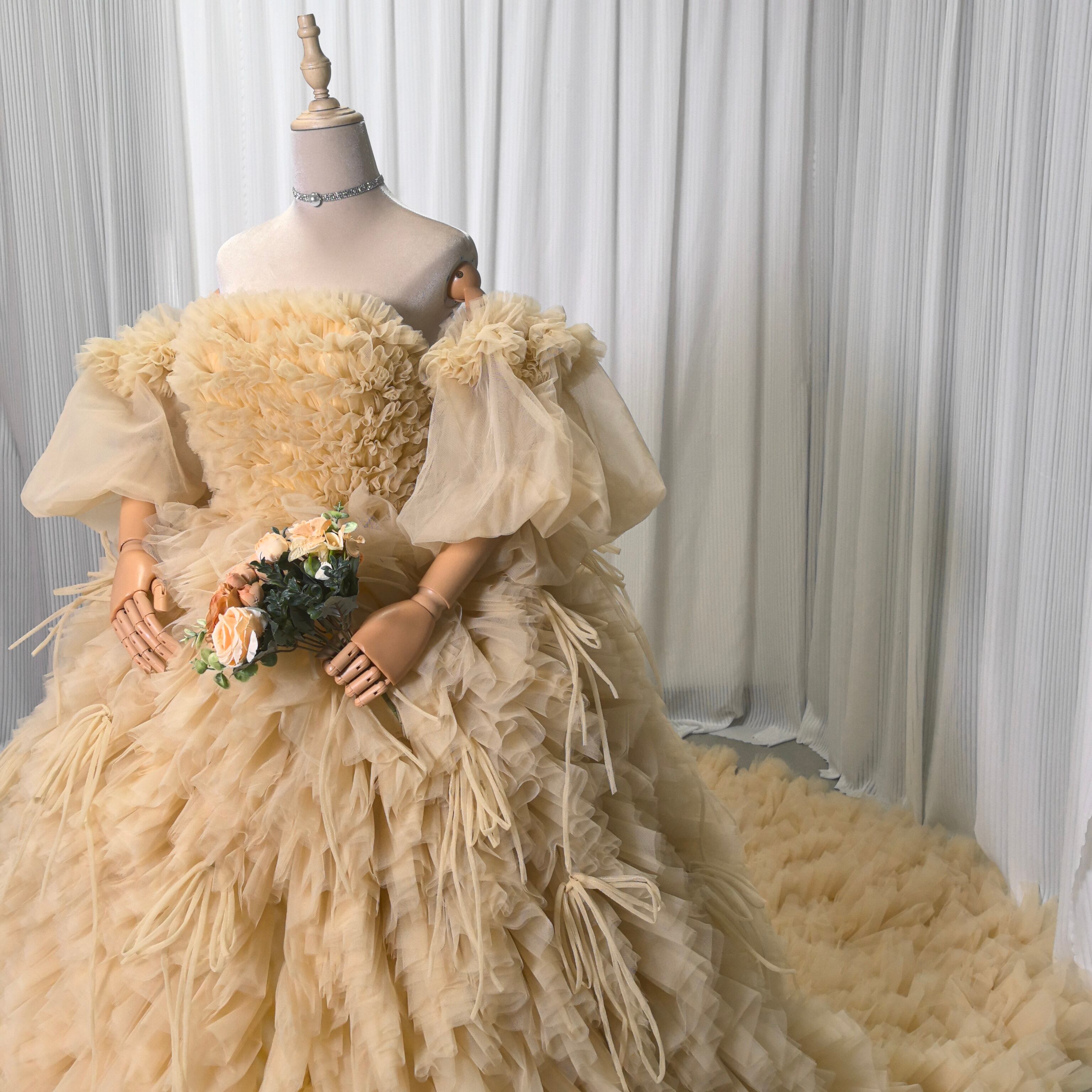 カラードレス イエロー パフスリーブ プリンセスライン ブライダル スリット リボン 華やかなトレーン フレアスカート