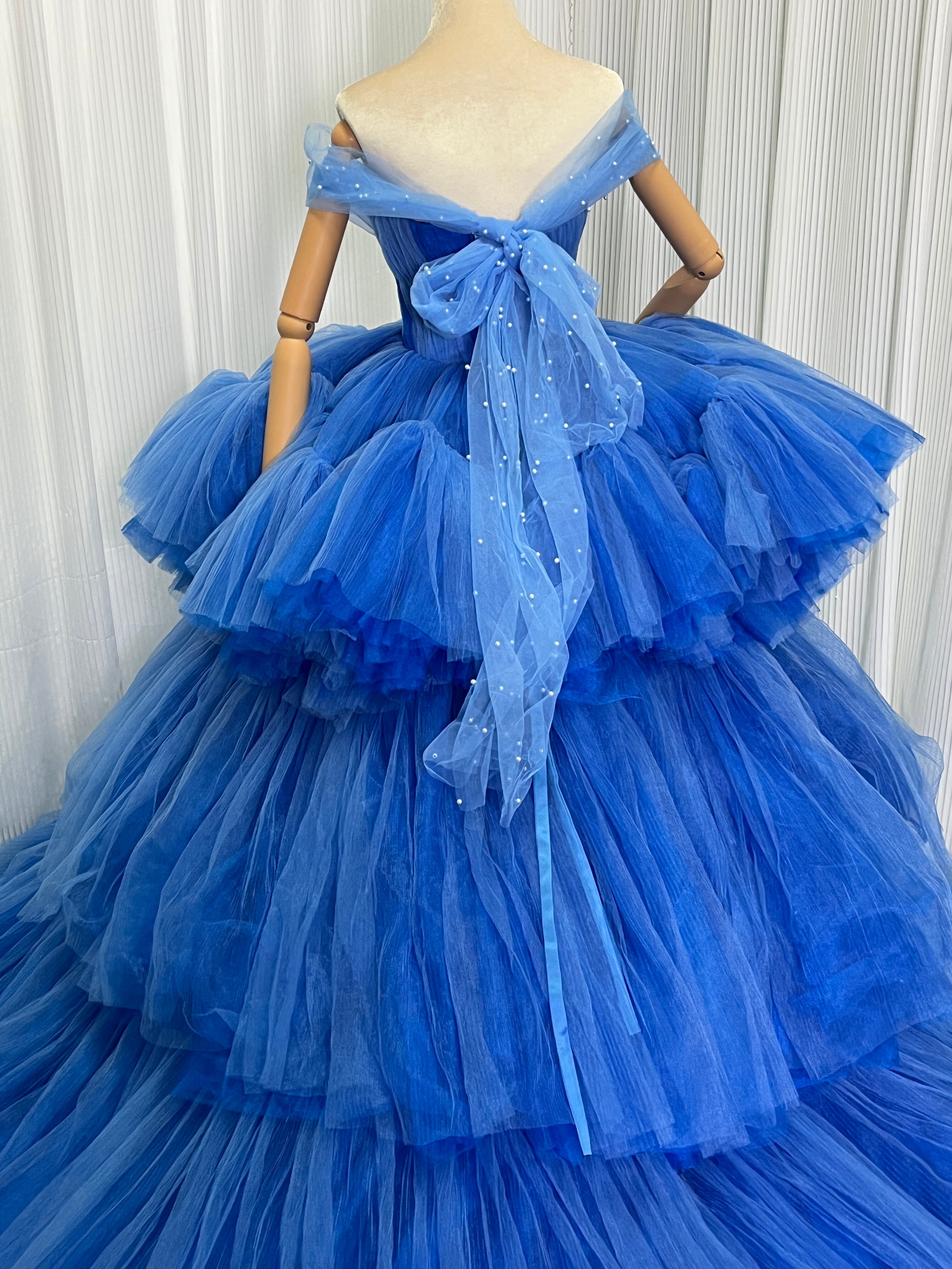 カラードレス 爽やかで優しいブルー 上品! 取り外しオフショルダー エレガント ビスチェタイプ レイヤードドレス ソフトチュール フレアスカート のコピー