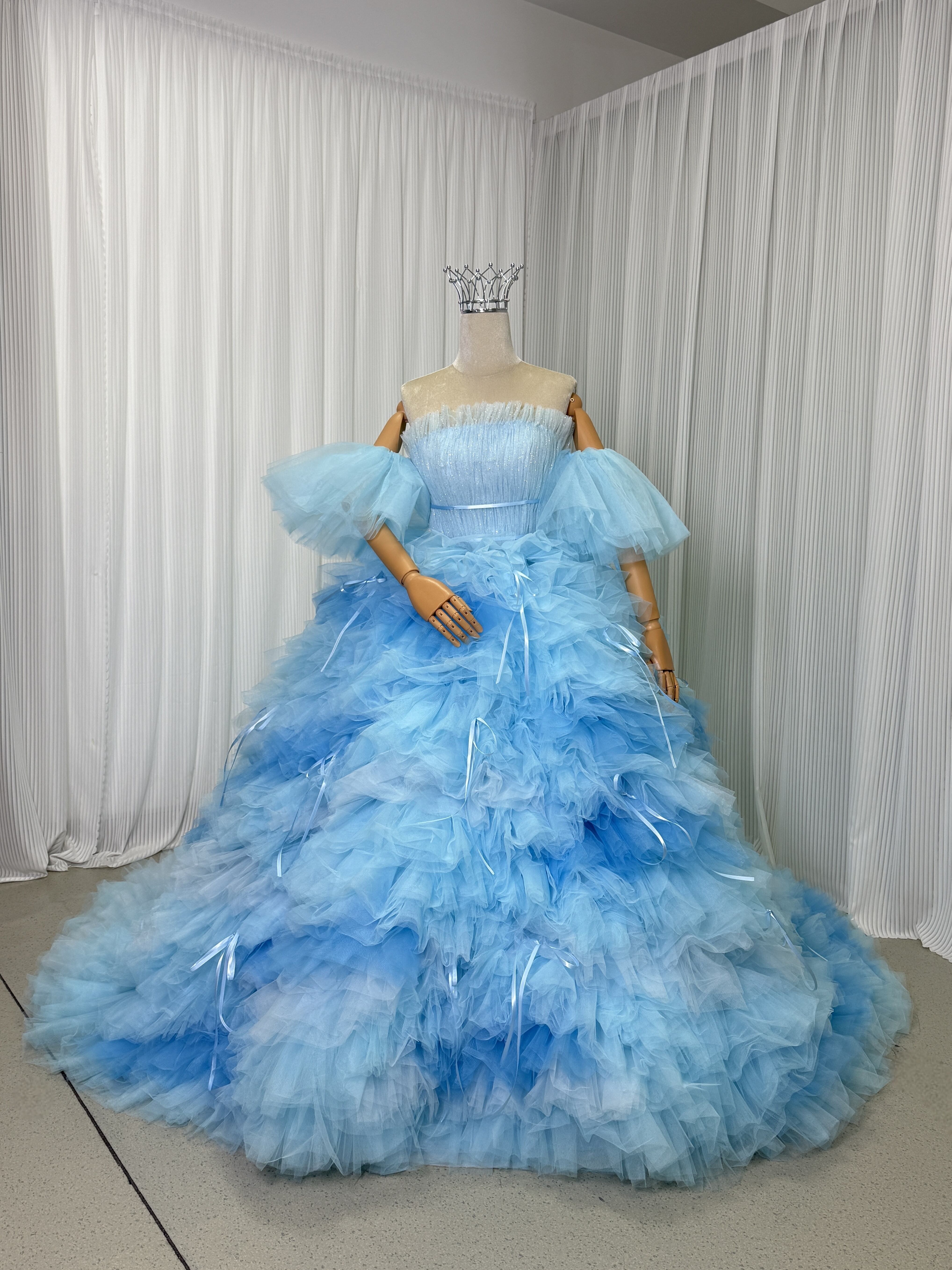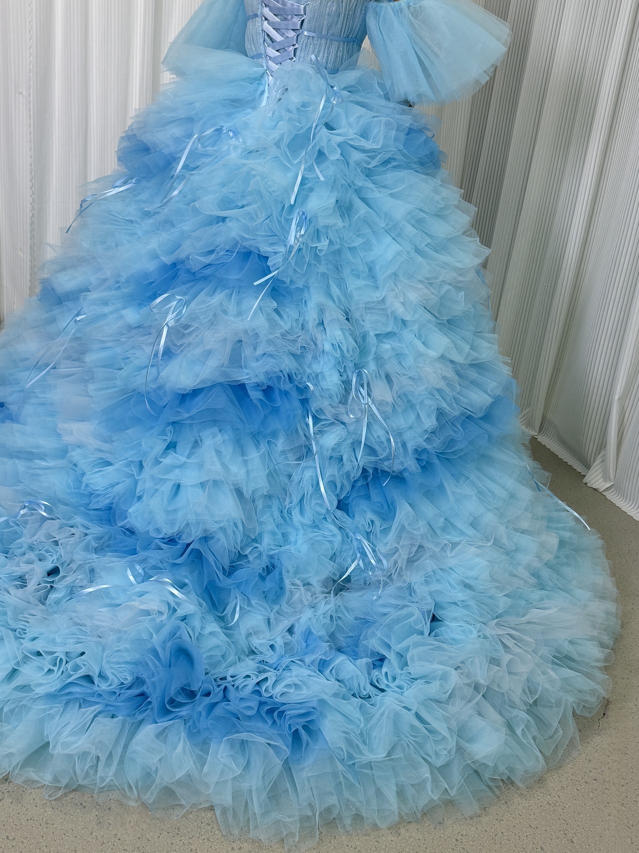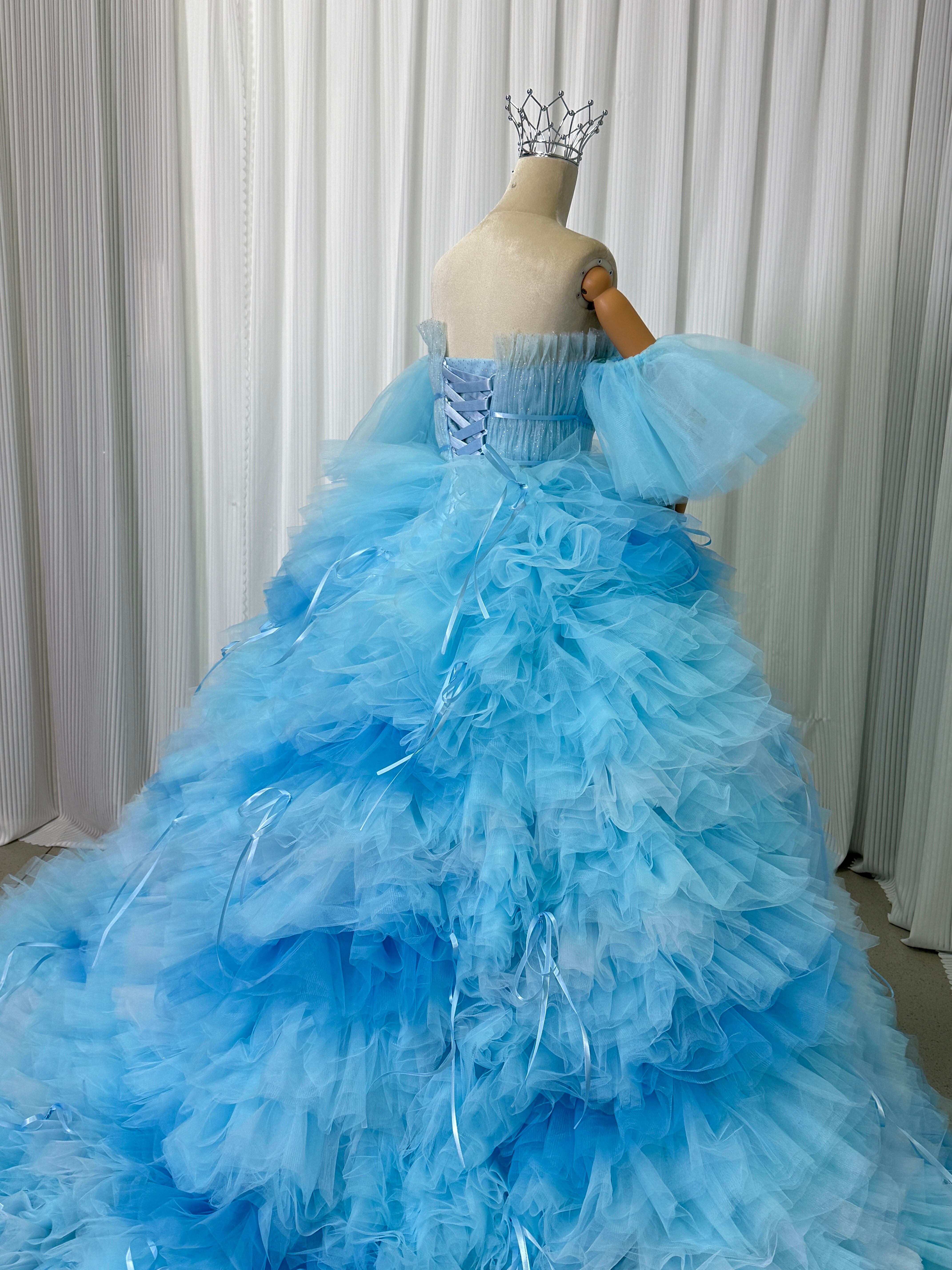 カラードレス 爽やかで優しいブルー フランス風 ビスチェタイプ 取り外し袖 リボン ソフトチュール 華やかなトレーン フレアスカート