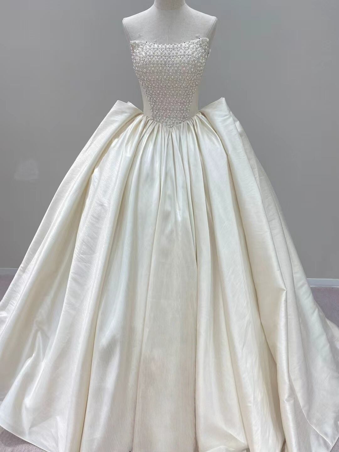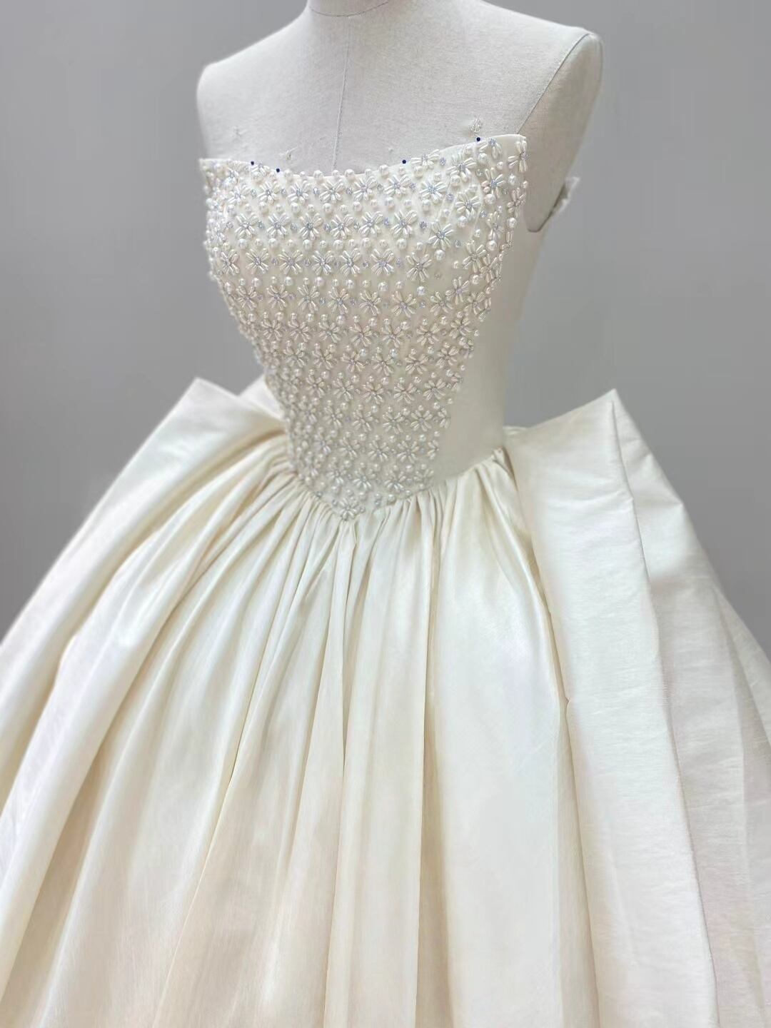 ウエディングドレス オフホワイト パール 取り外しオフショルダー 華やか 結婚式 Aライン アンティークなドレス