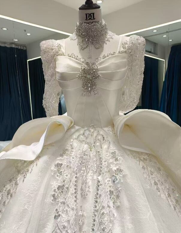 ウエディングドレス オフホワイト ロングスリーブ ビジュー 豪華! エレガント 華やかなトレーン 結婚式