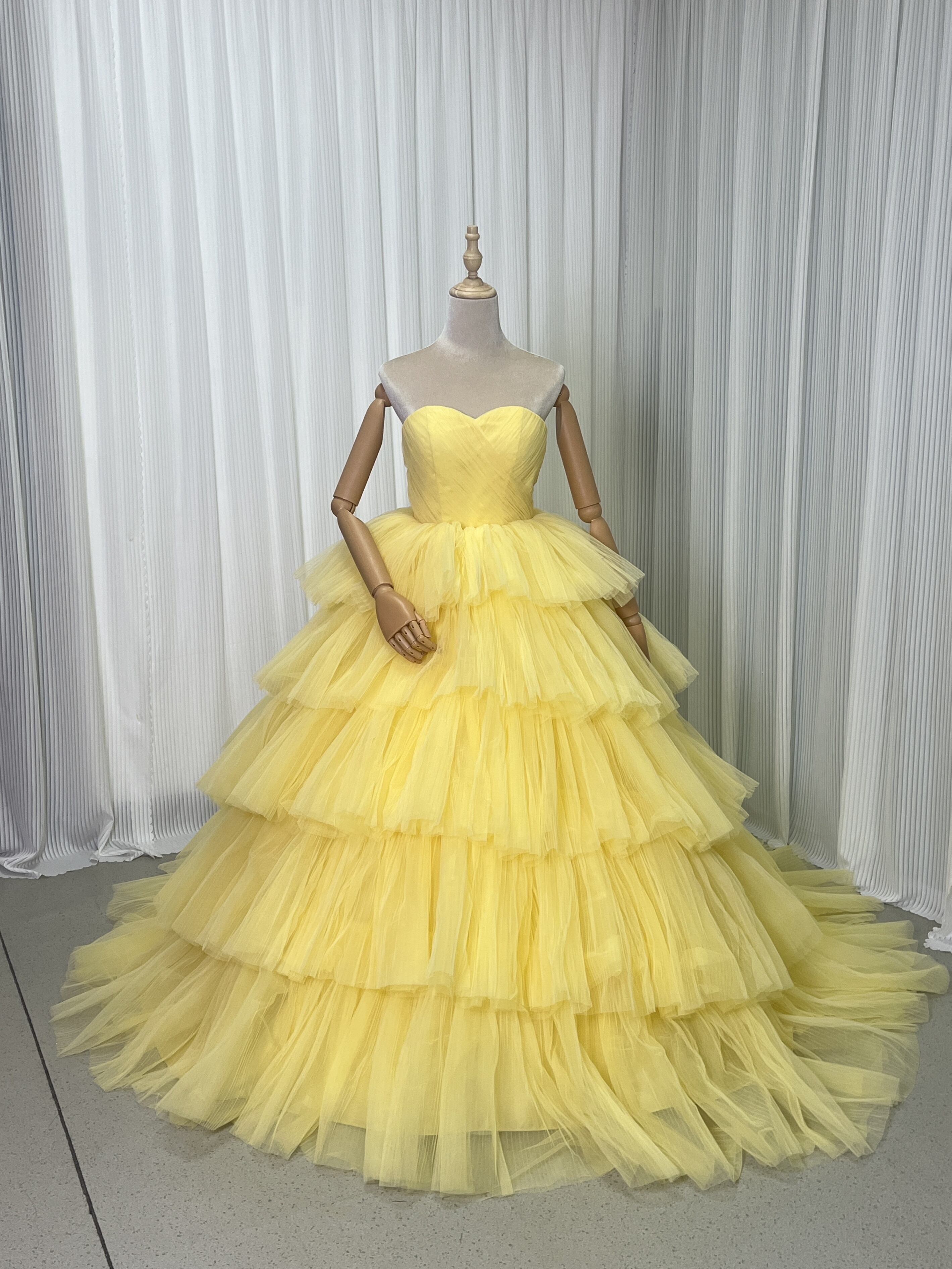 カラードレス 黄色い ベアトップ ファスナー プリンセスライン ソフトチュール 華やかなトレーン フレアスカート