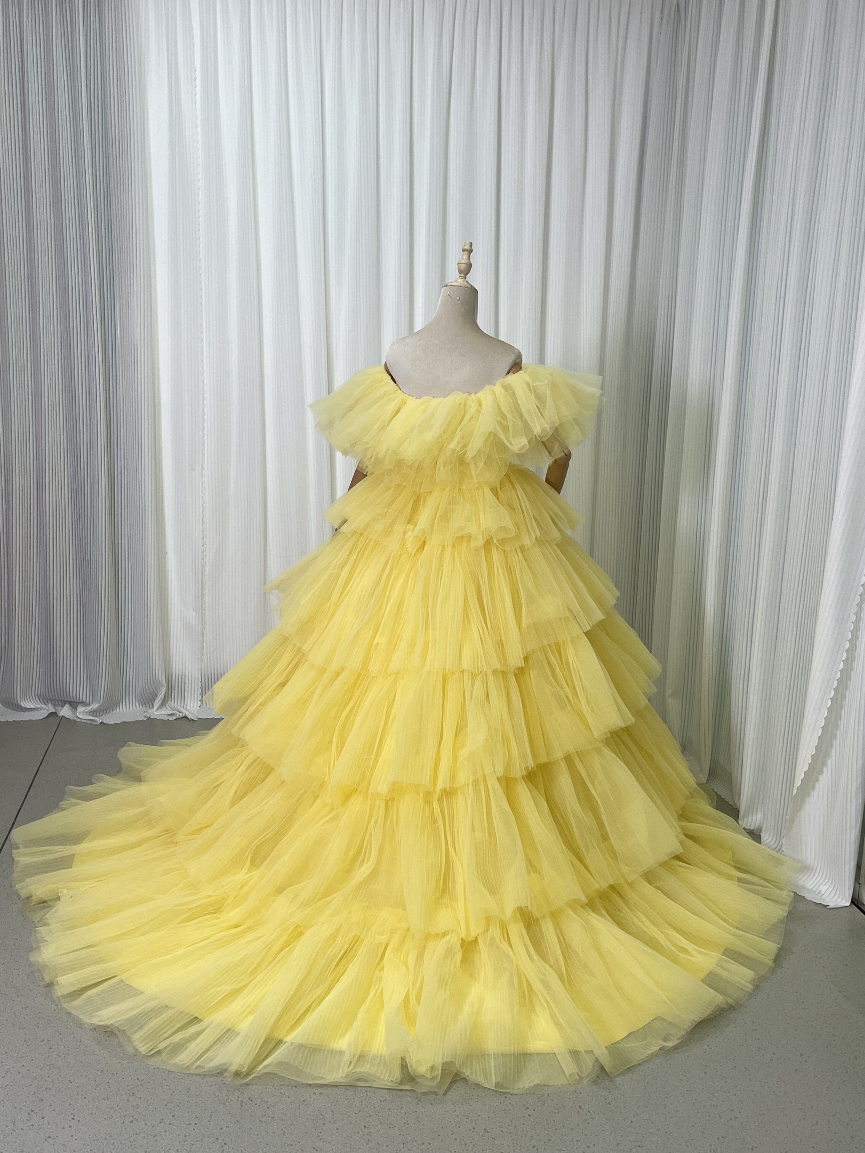 カラードレス 黄色い ベアトップ ファスナー 取り外しオフショルダー プリンセスライン ソフトチュール 華やかなトレーン フレアスカート