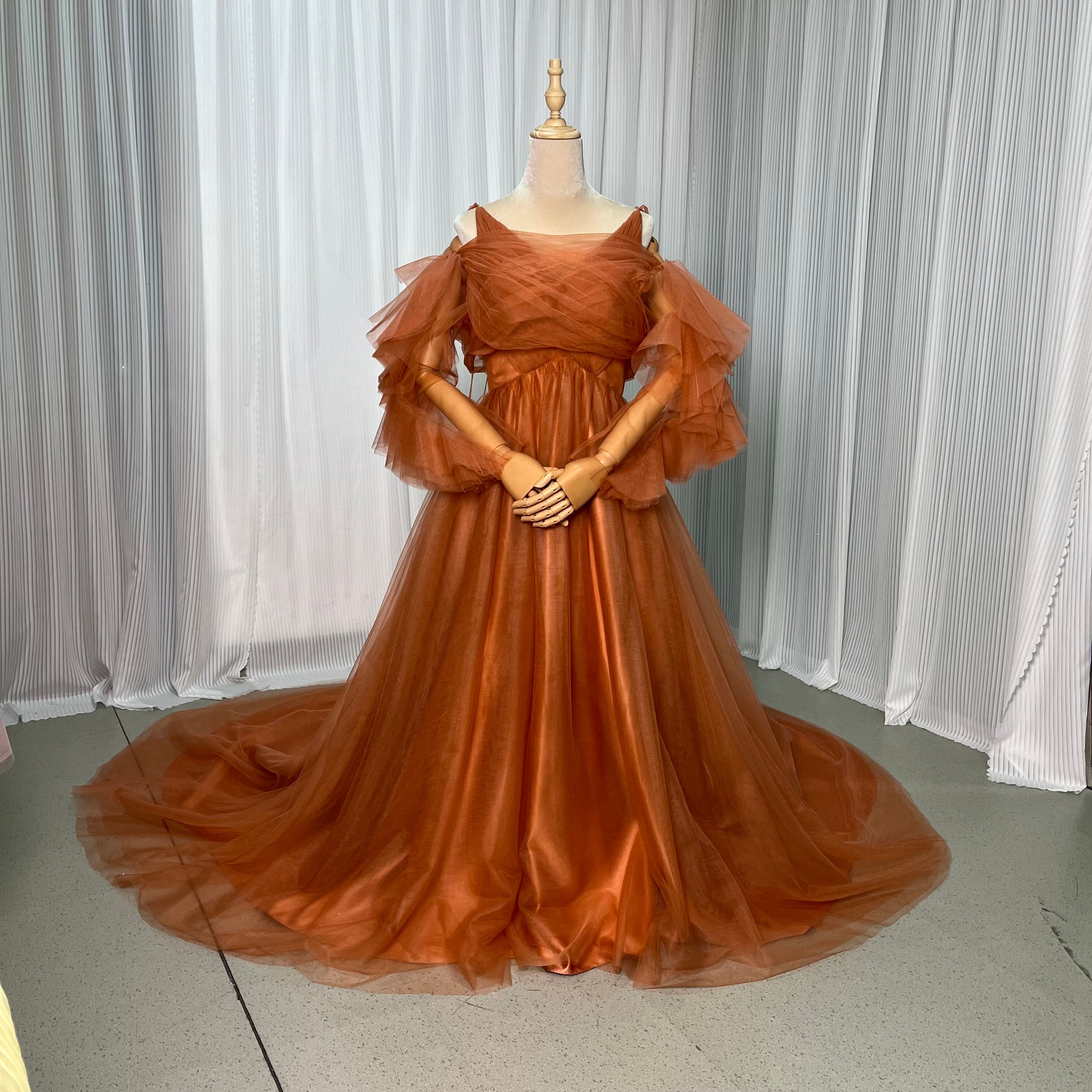 カラードレス テラコッタ オンショルダードレス バックレス 華やかなトレーン アンティークなドレス+ロングスリーブトップス