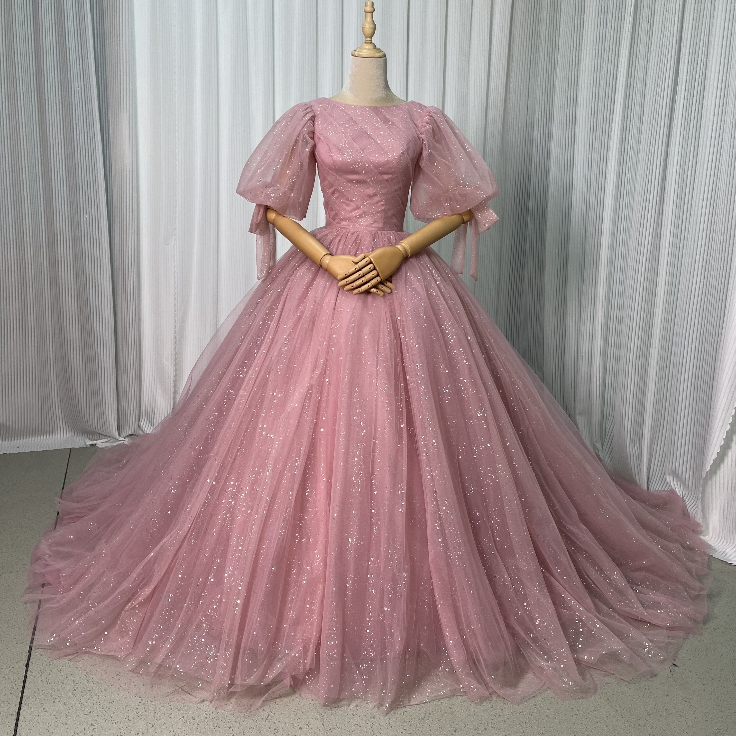 カラードレス ピンク ラウンドネック 編み上げ 七分袖丈 キラキラグリッターチュール ソフトチュール 華やかなトレーン