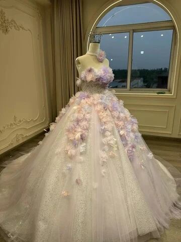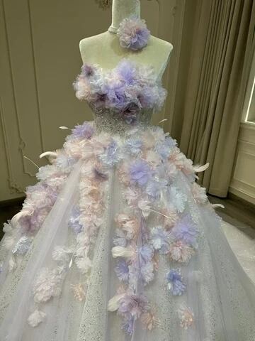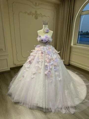 カラードレス ホワイト ベアトップ 3D立体レース刺繍 憧れのドレス キラキラグリッターチュール 花嫁 華やかなトレーン