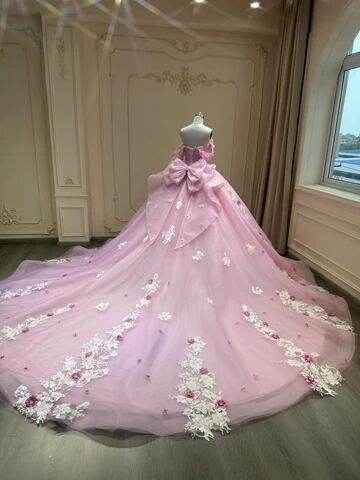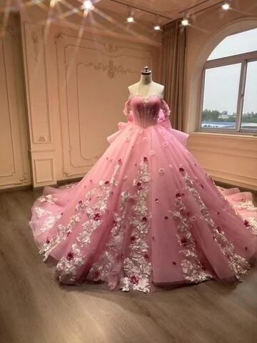 カラードレス ピンク ベアトップ オフショルダー ビジュードレス 3D立体レース刺繍 ふっくら柔らかなバックリボン 上品! 華やかなトレーン