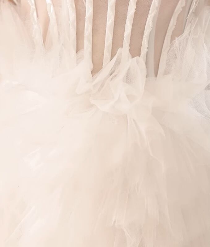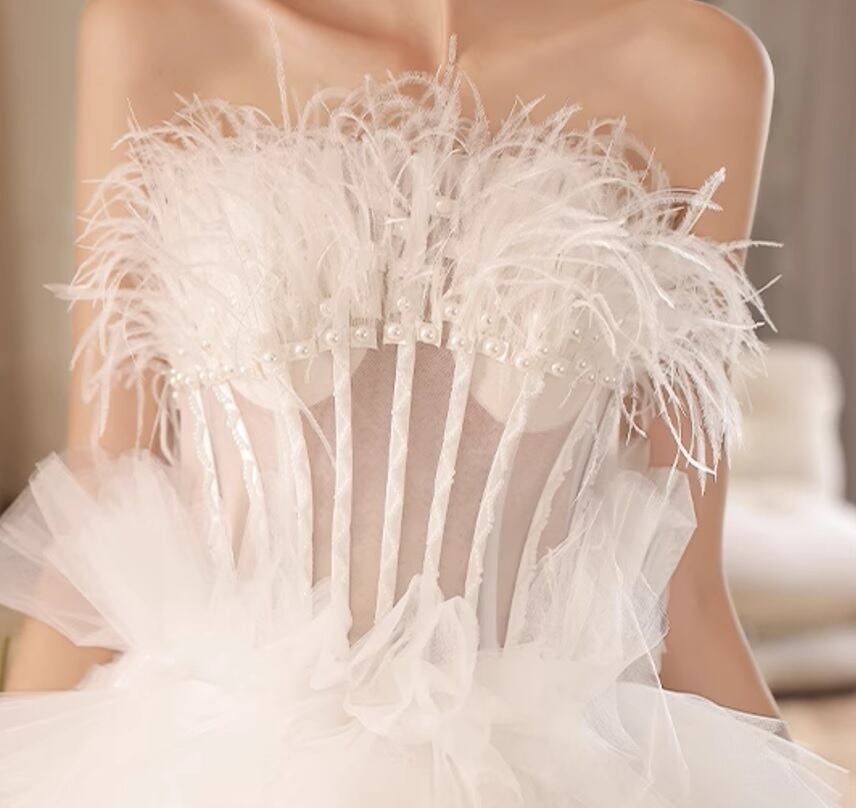 ウエディングドレス ホワイト フェザー ソフトチュール ベアトップ ビスチェタイプ プリンセスライン 華やかなトレーン