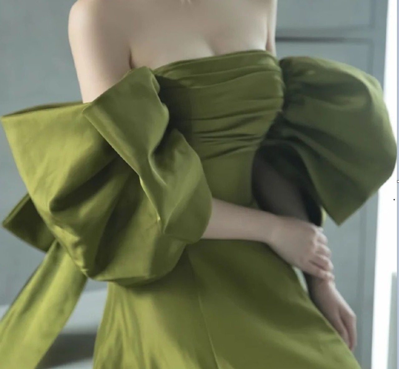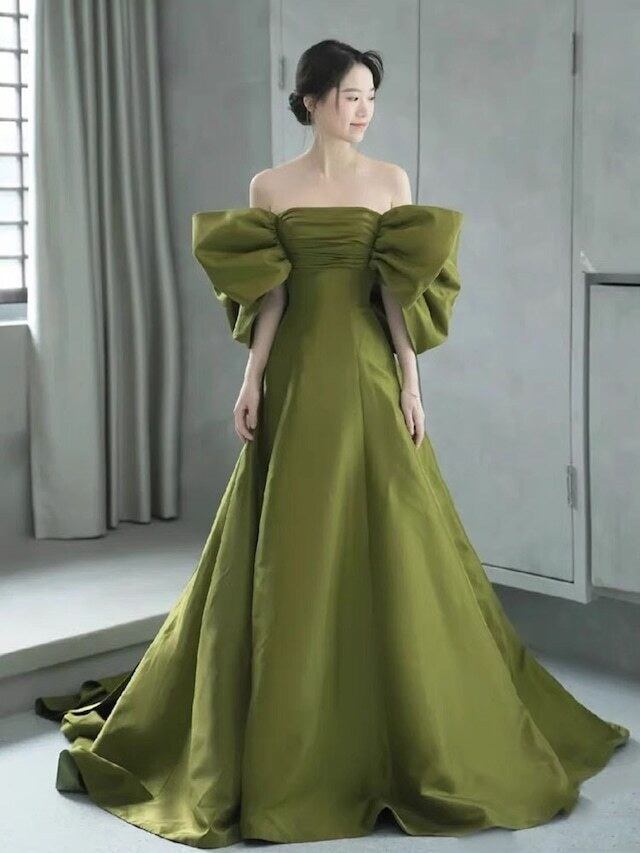 カラードレス グリーン オフショルダー ベアトップ ふっくら柔らかなバックリボン アンティークなドレス ミニトレーン