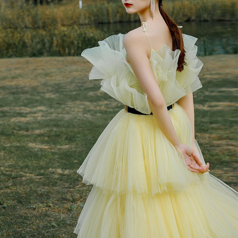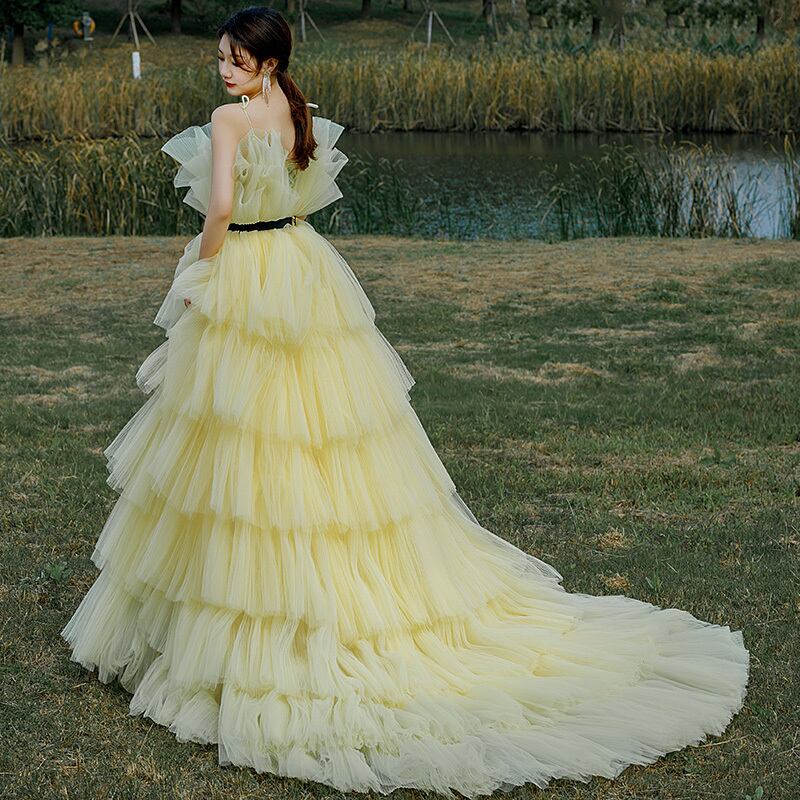 カラードレス 黄色い ソフトチュール プリンセスライン レイヤードドレス サッシュベルト ノースリーブ 華やかなトレーン ティアードのドレス