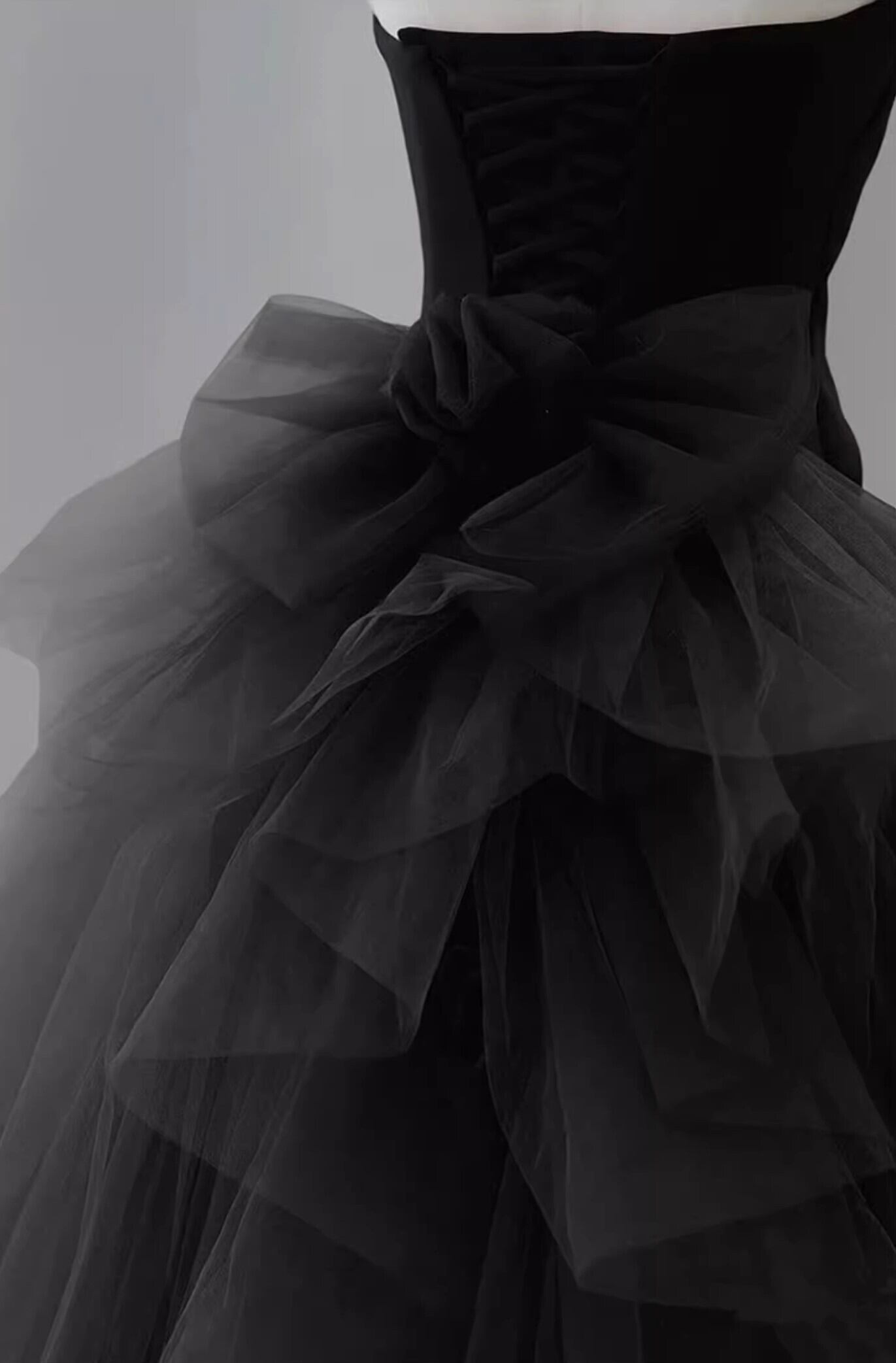 カラードレス ブラック ベアトップ ビスチェタイプ ふっくら柔らかなバックリボン アシンメトリー風 エレガント チュールドレス