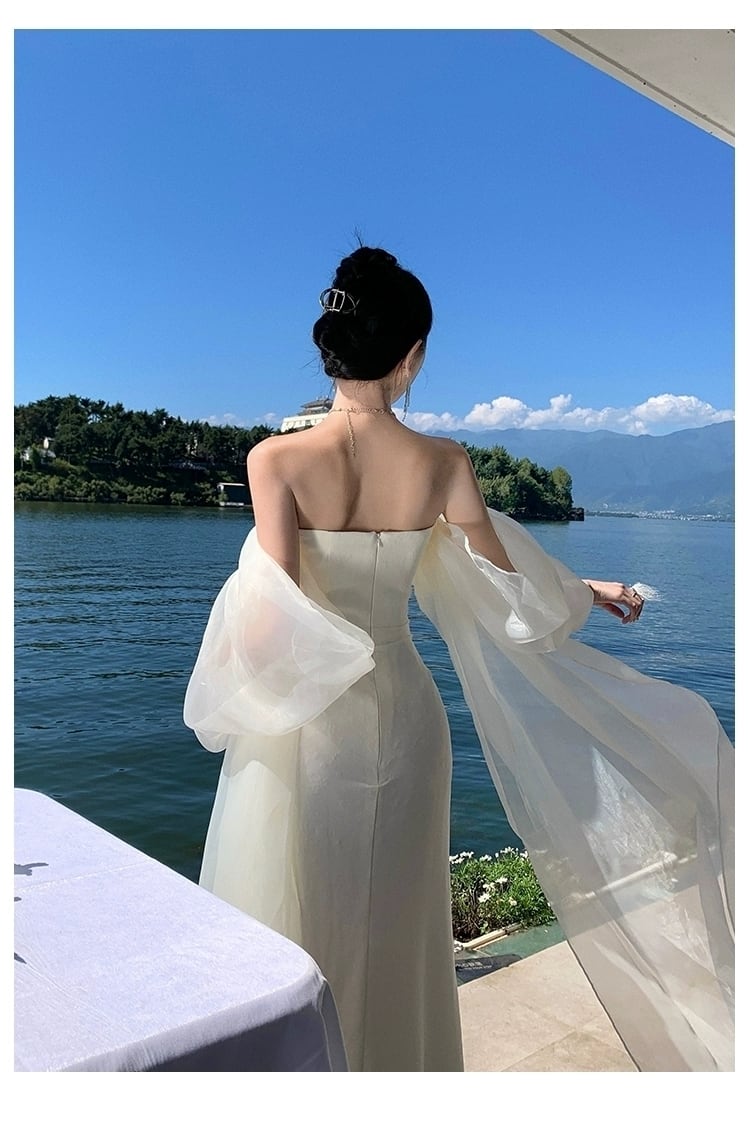 ウエディングドレス オフホワイト ベアトップ ファスナー ふわふわ袖 マーメイドライン 細見えシルエット