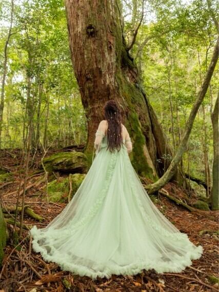 実例写真! カラードレス グリーン ロングスリーブ エレガント ブライダル 柔らかく重ねたチュールスカート